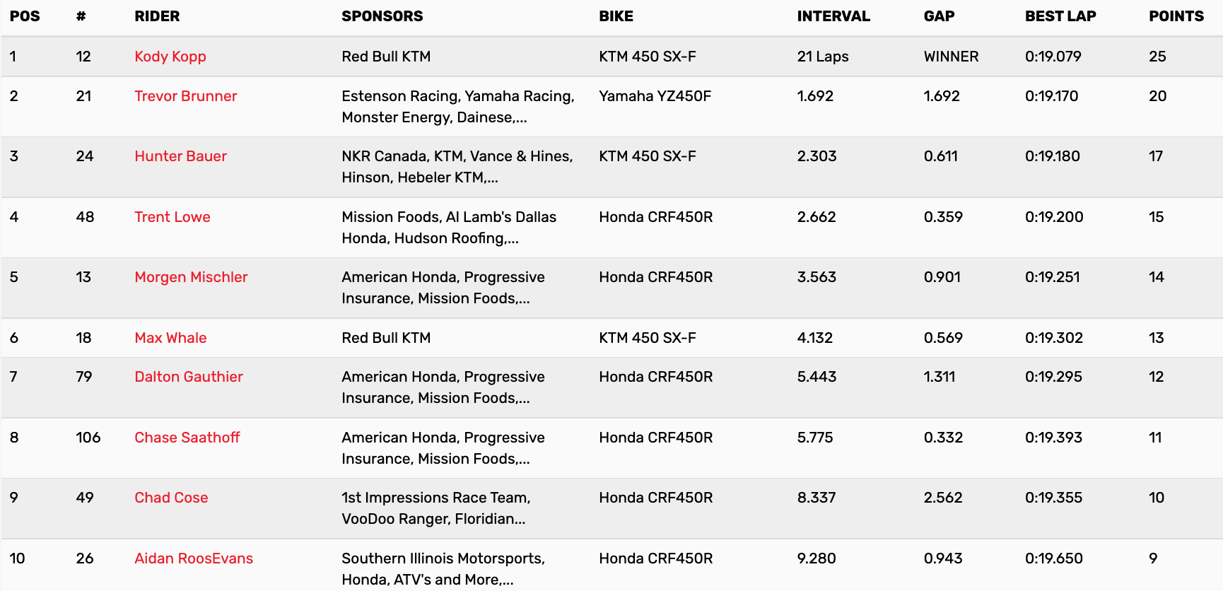 | 6 | Ty Masterpool | Paradise, TX | 8 - 8 | KTM 250 SX-F |