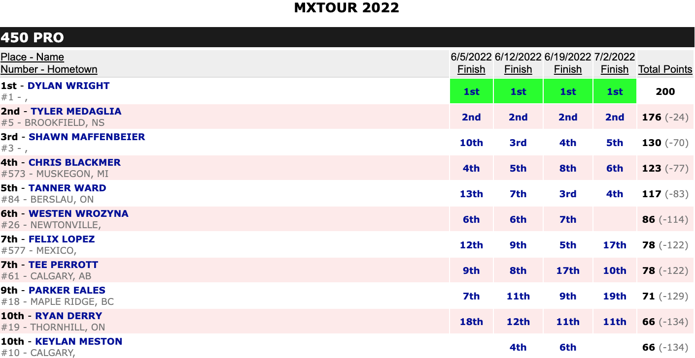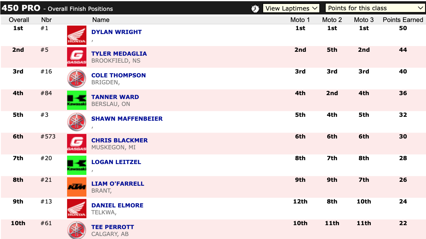 | Dylan Wright (Honda) | Canadian Triple Crown (Motocross) | 450 |
