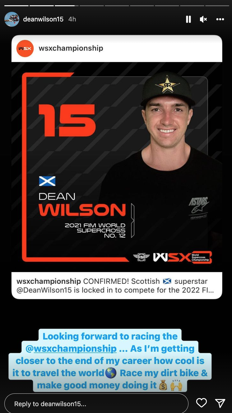 The official FIM World Supercross Championship account posted the news on Instagram, which Wilson reposted to his story with the following: