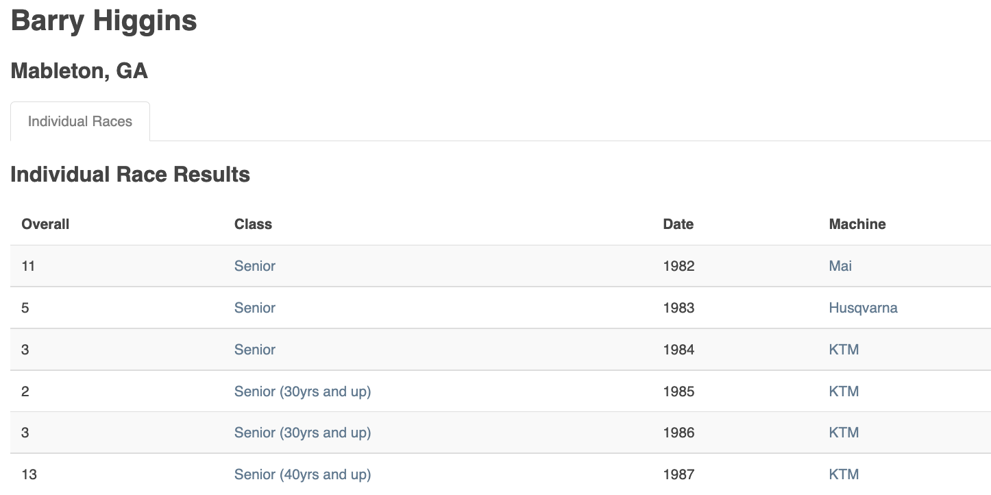 Higgins raced the Senior 30+ class every year from 1982-1987. He scored a couple of third place finishes in ’84 and ’86 and placed second in ’85.