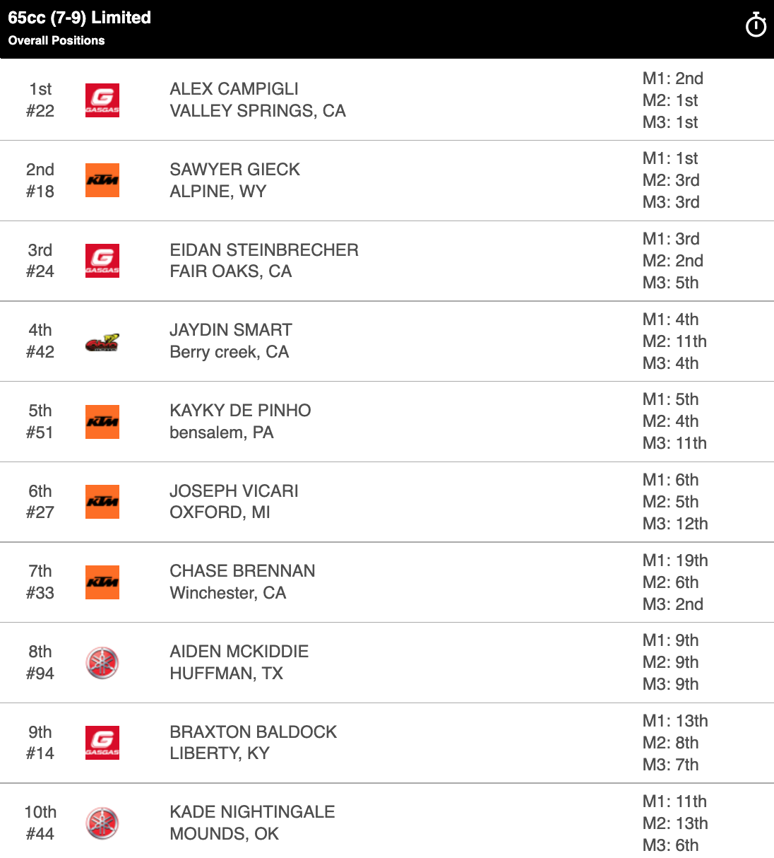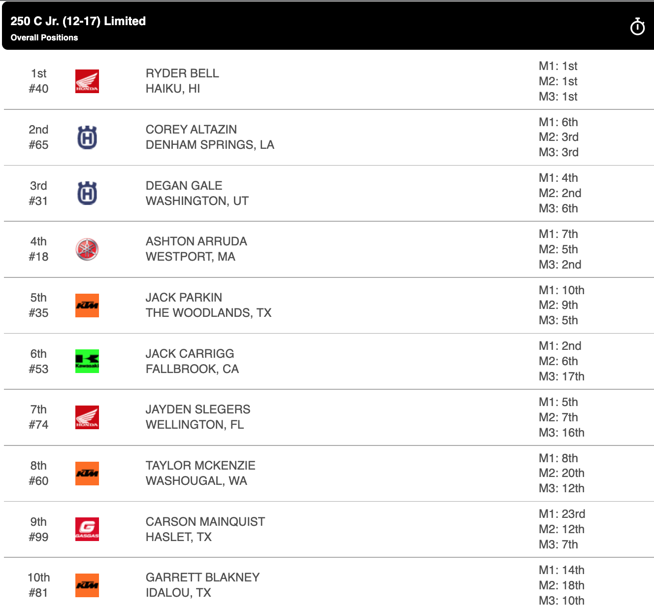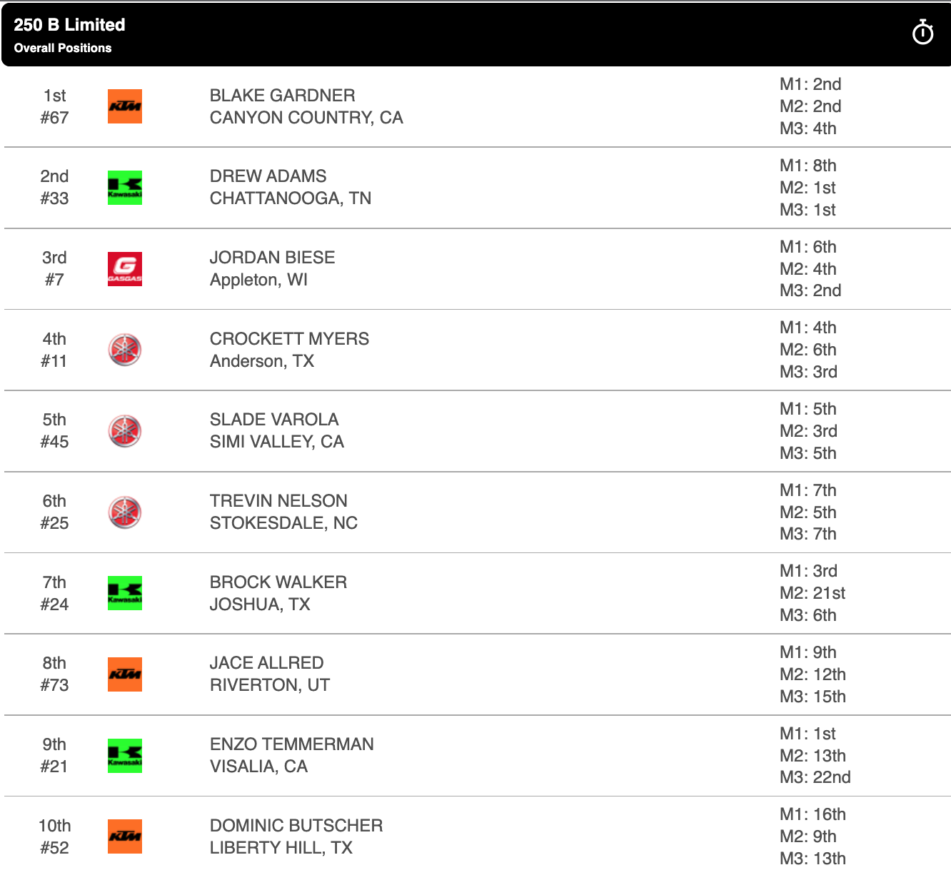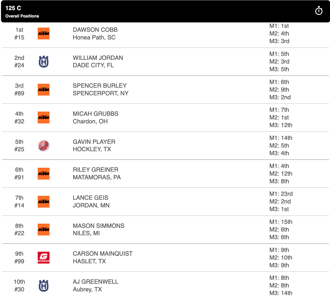 | Carson Brown (KTM) | Red Bull Straight Rhythm | 125/150cc |