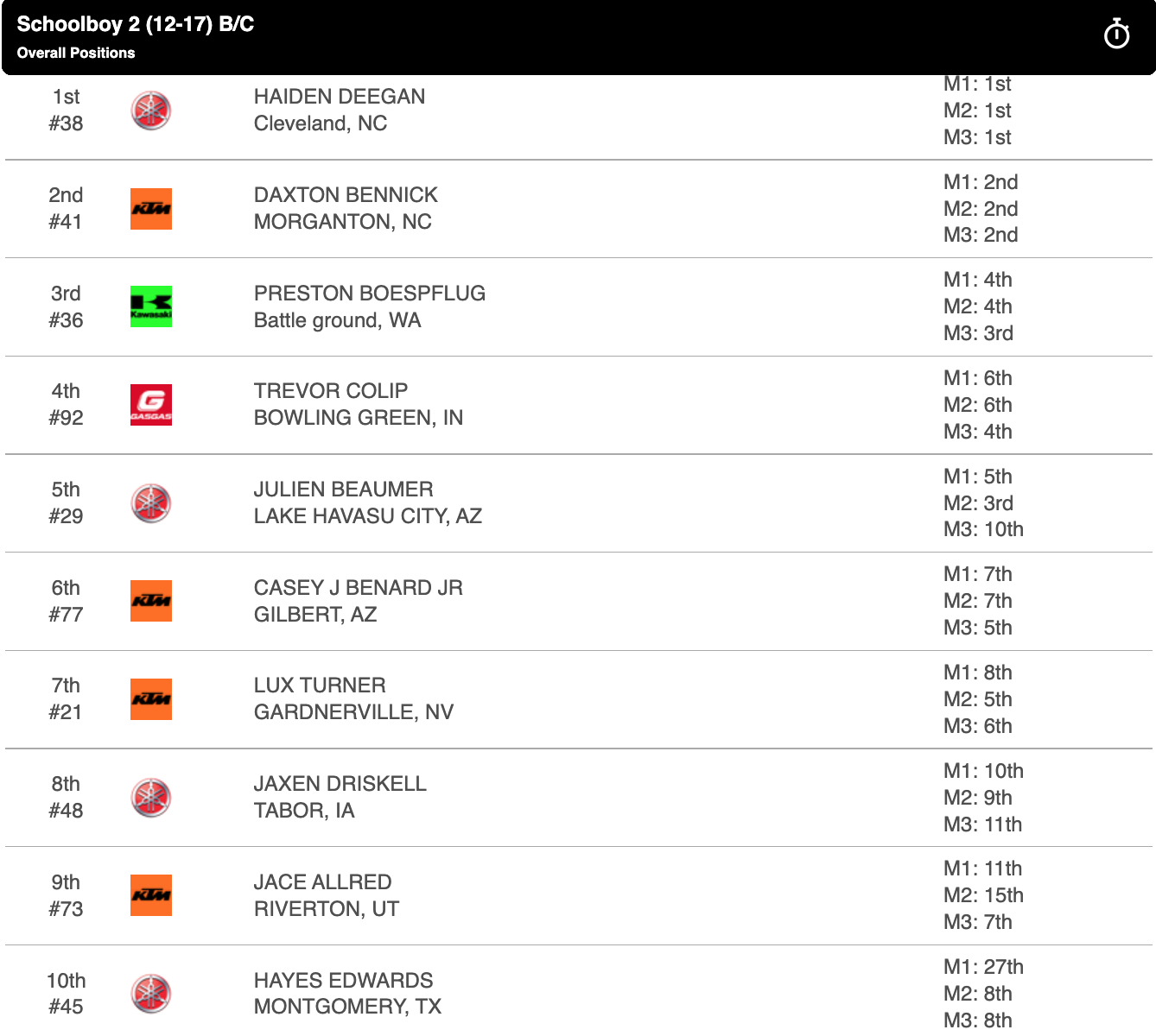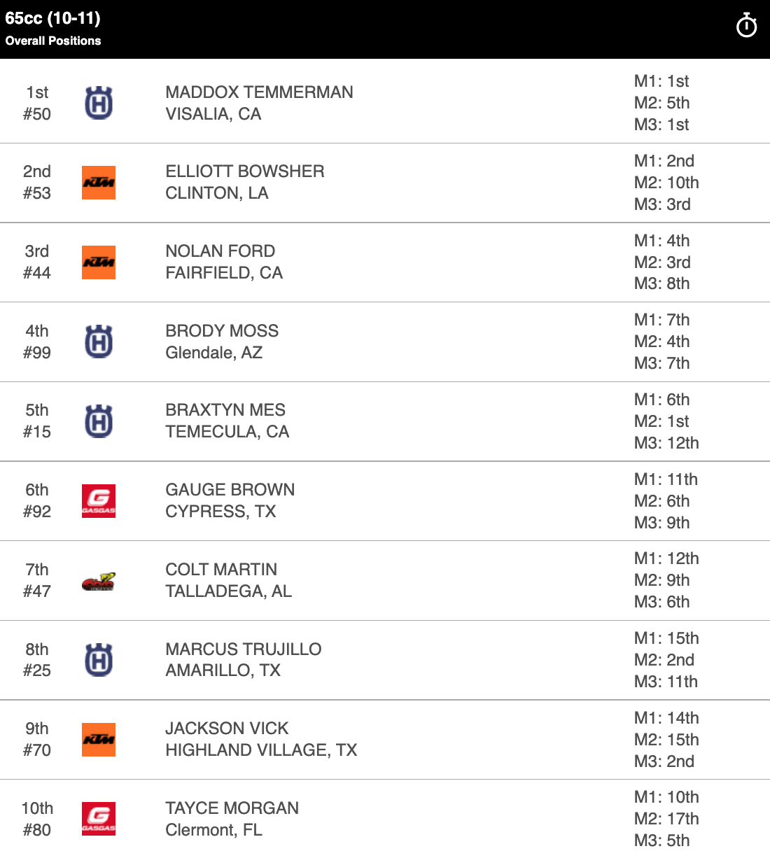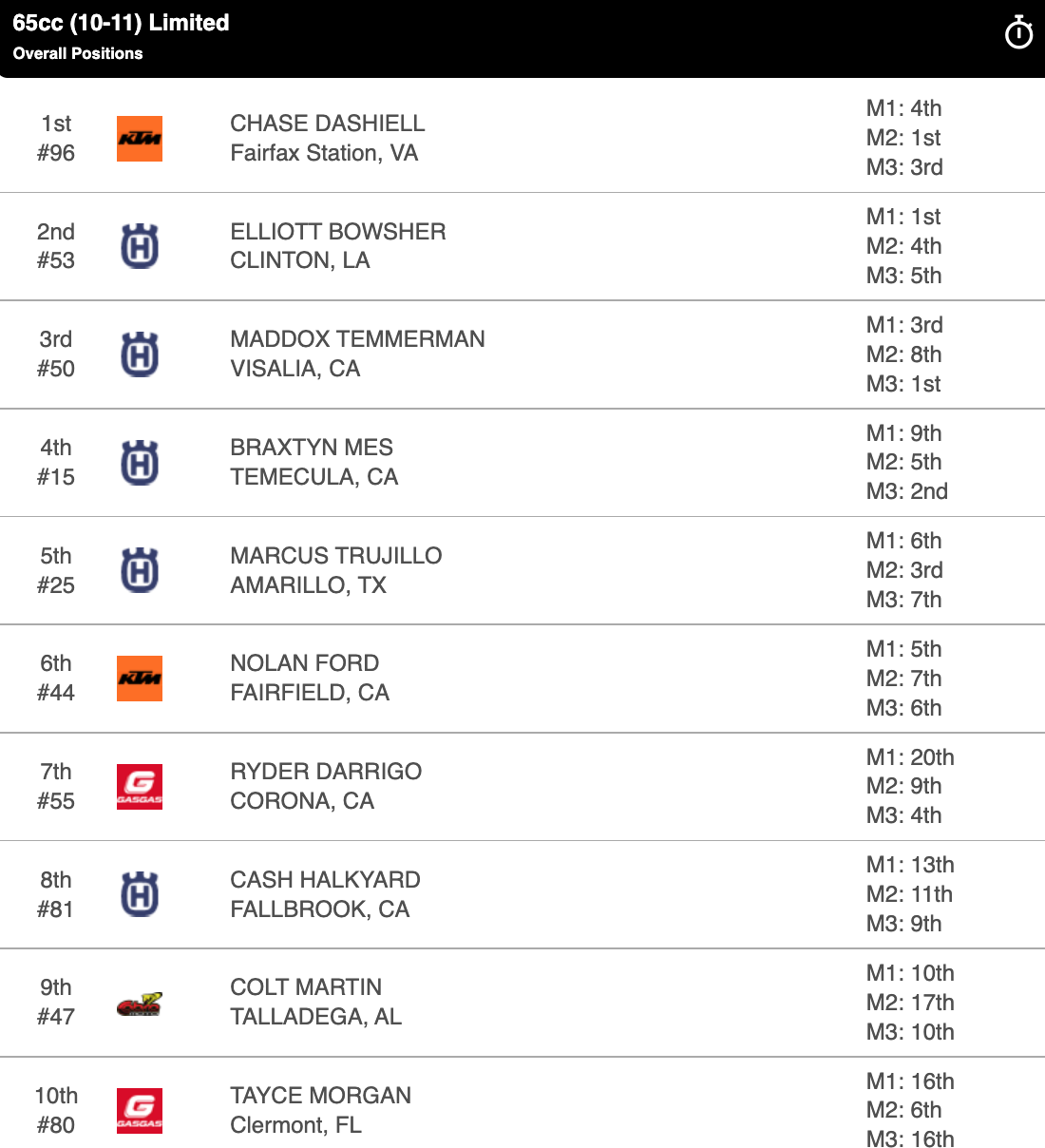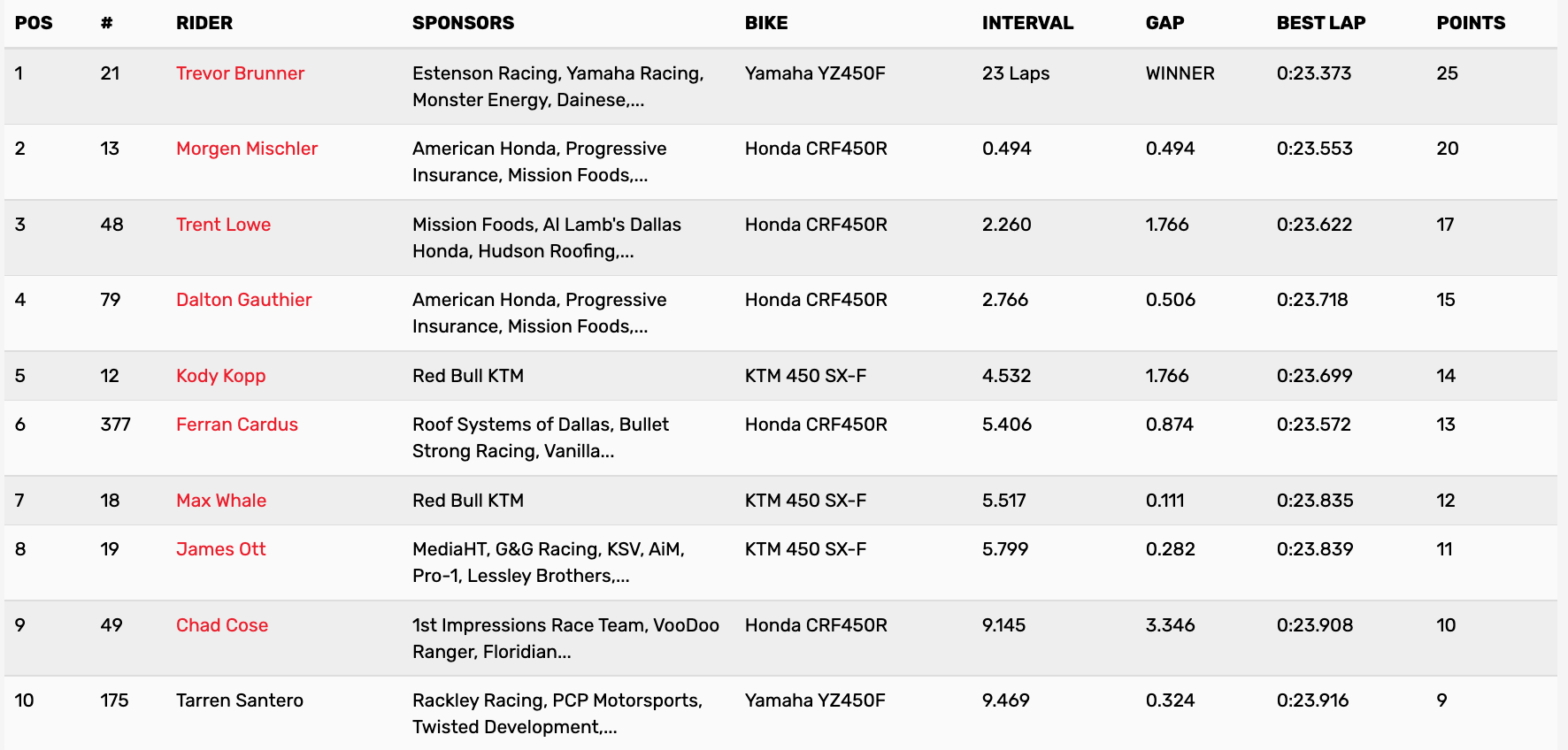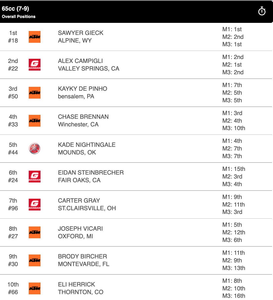 | Carson Brown (KTM) | Red Bull Straight Rhythm | 125/150cc |