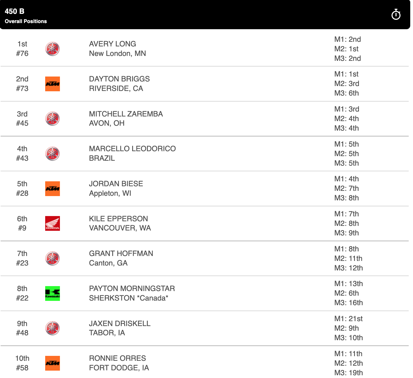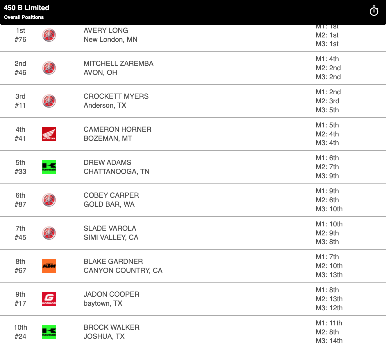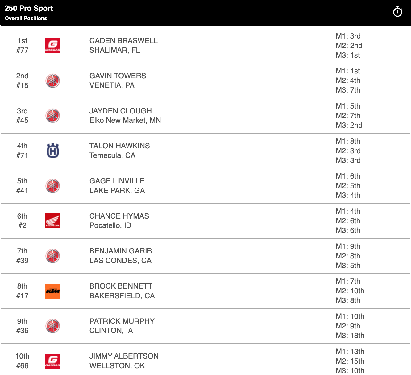 | Eli Tomac (Yamaha) | Lucas Oil Pro Motocross | 450 Class |