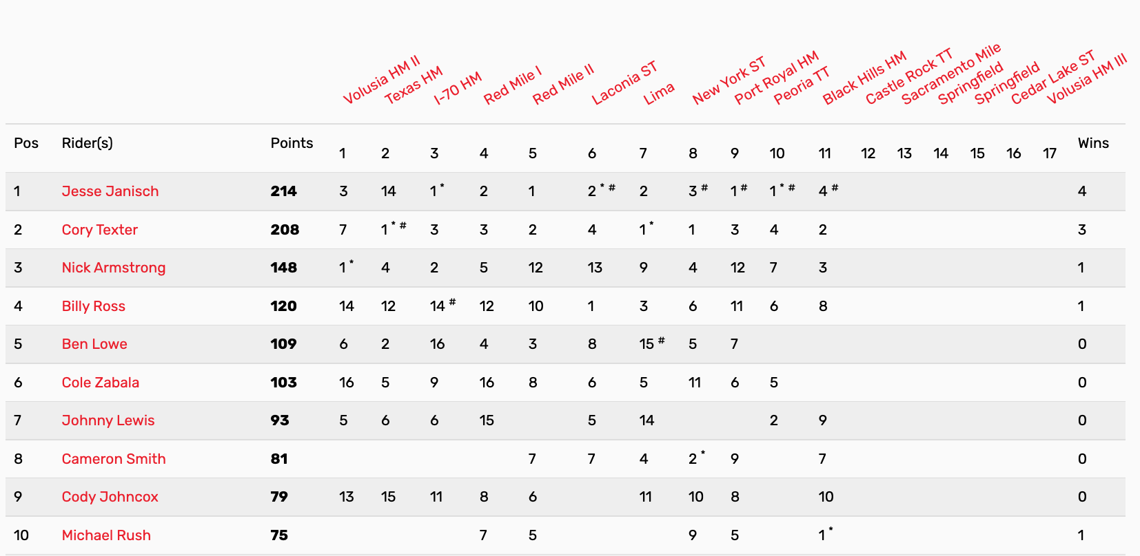 | Jesse A. Janisch (Harley-Davidson) | American Flat Track | AFT Singles |