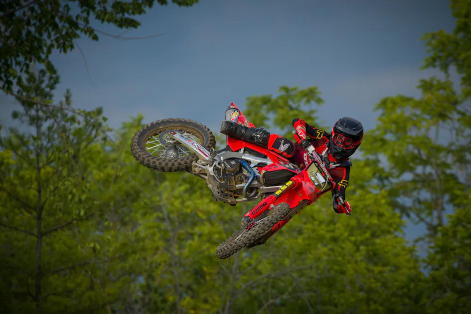 Round one I went out, I got second in the first moto and ended up coming from 35th or something and then winning the round. Then Monday after, I got really sick. I could barely move. I laid in my bed all day just for five days straight. Super sick, throwing up. Just gnarly. Then with the second round, same thing. I had no energy. I was struggling to breathe and everything. I went 4-3-4 for fourth overall, or something. Then going into the third round, I was still a little bit sick. Then I ended up hurting my tailbone on the seat or the sub-frame. I couldn’t sit down on it, so that was pretty sore. I was struggling with that and still with the breathing and it was 42 degrees Celsius. Probably almost a hundred in Fahrenheit. Just still struggling with the breathing. Got back to Ontario. Went to Walton, and going into Walton it was just stop the bleeding for points. We did that. I lost one point, but I wasn’t the points leader at the time. Then going to Gopher, I went 2-2. Starting to feel better. Starting to feel like myself again on the bike. Then went to Sand Del Lee and ended up crashing doing starts. I hit this big boulder in the grass that I didn’t see.