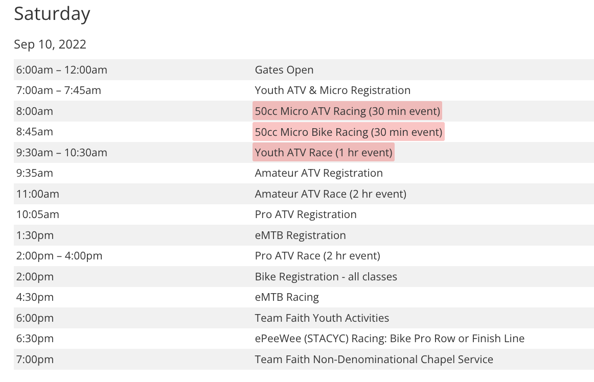 *Note: All times on the race day schedule local to Glen Jean, West Virginia