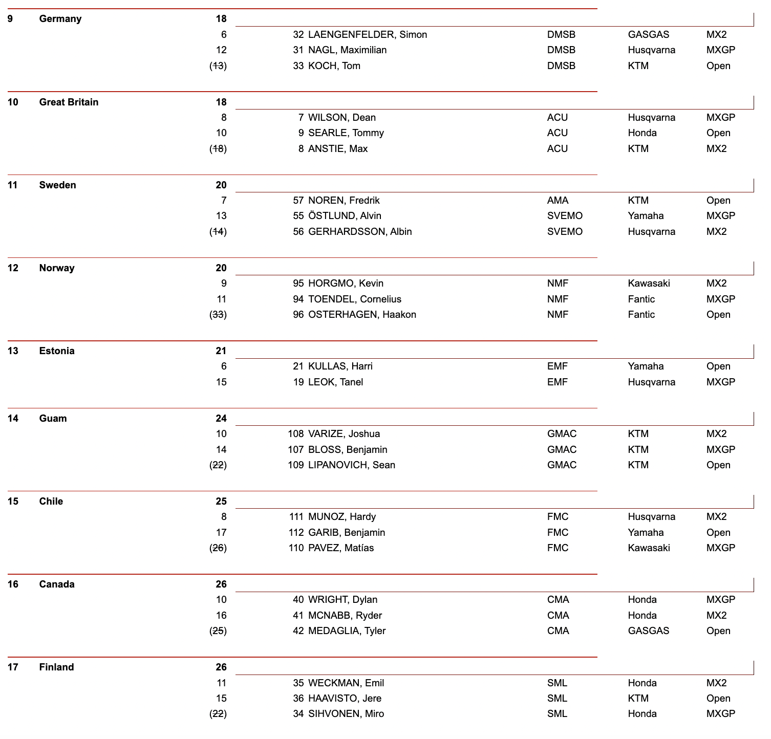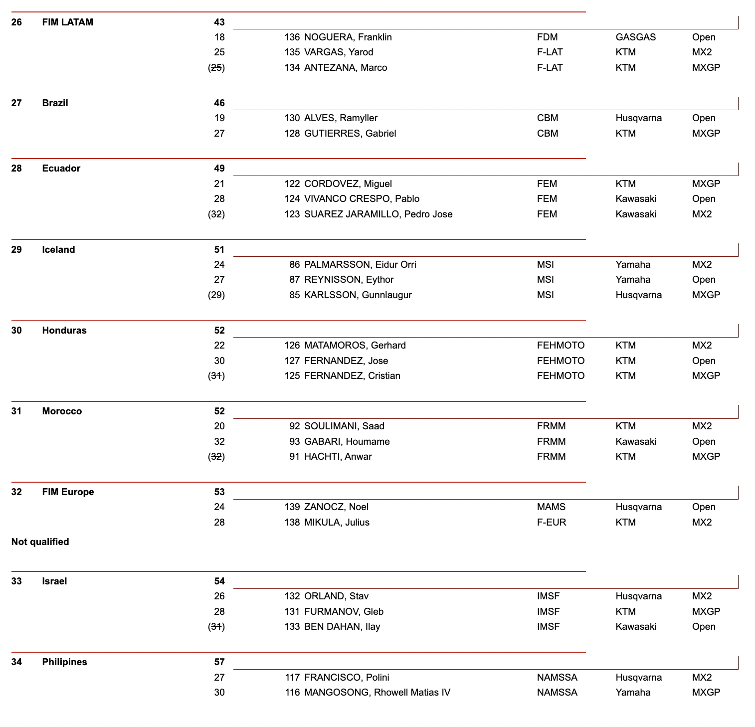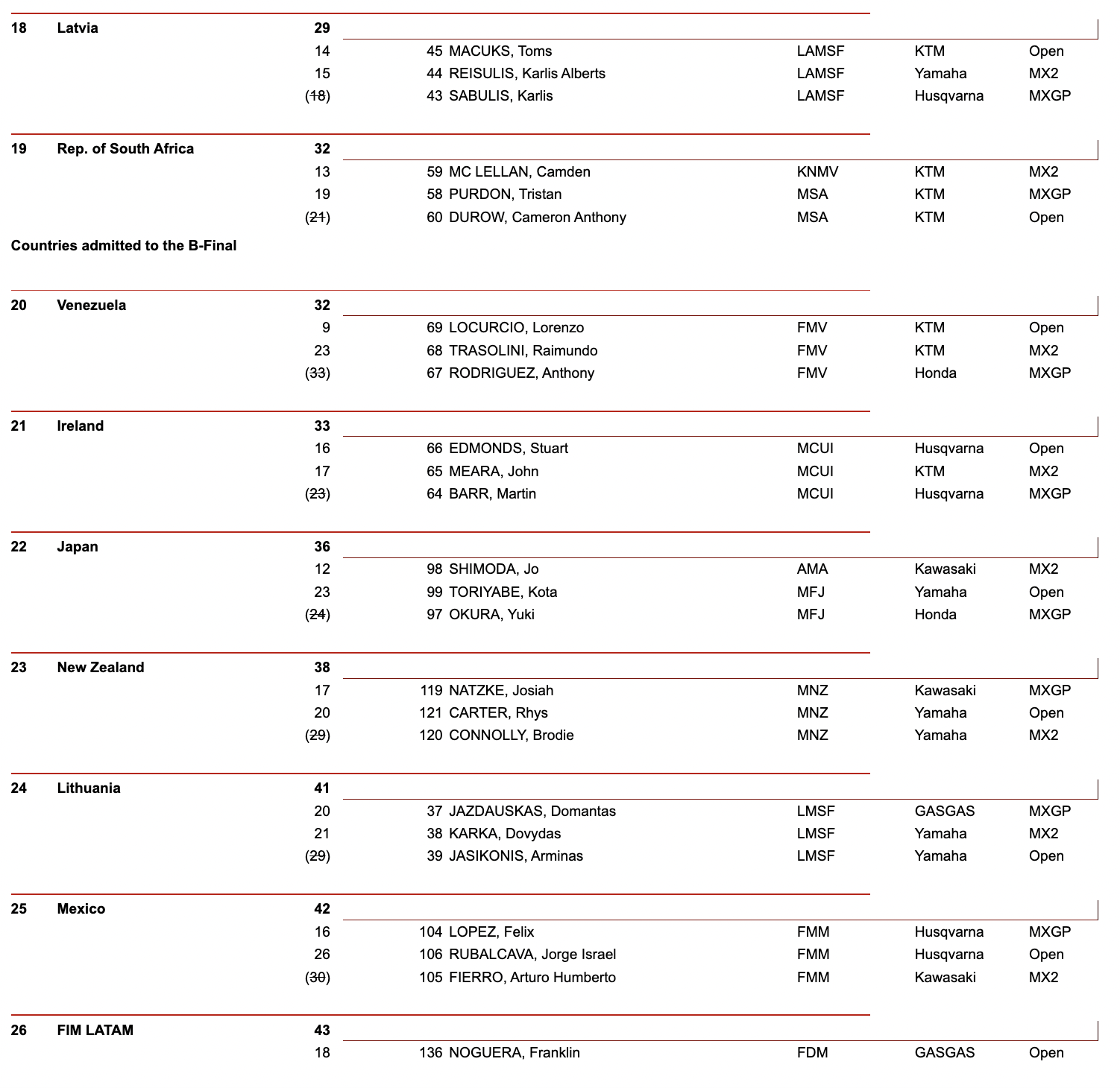 Ferrandis would take the final qualifying race victory of the day and a dejected Sexton would cross second. Team USA would qualify P1 though anyway as their 2-1 scores after a drop was still enough to take the top spot. France would move into second overall though with four points while Australia rounded out the podium with five points.