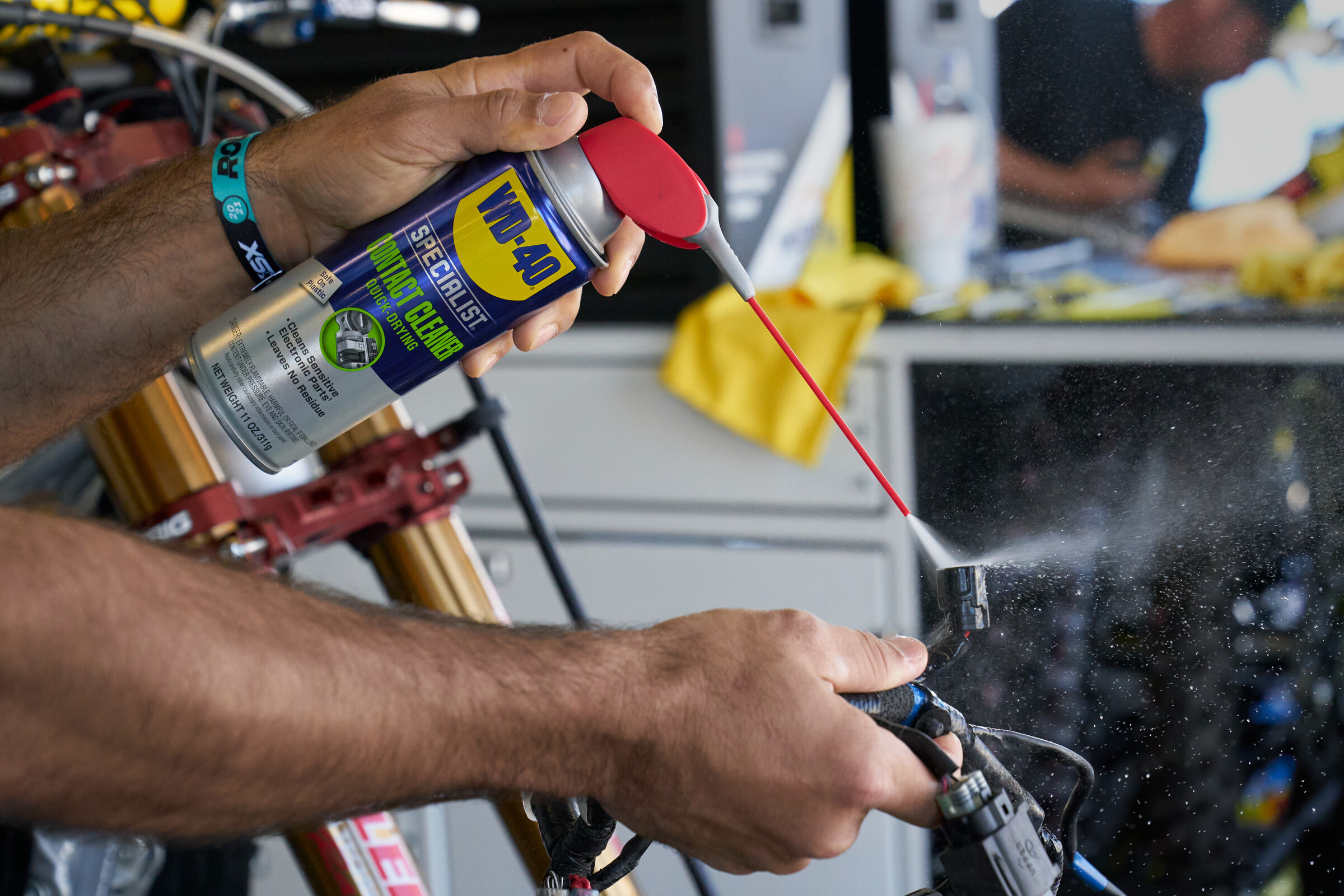 Having used WD-40 Brand products in some seriously harsh, high-pressure situations, Soules has started singing their praises to his fellow wrenches in the pro pits. “When I tell other mechanics about their next-level products like the WD-40 Specialist Silicone, they always go, ‘They make that?!’ So, besides the Original Formula and the Silicone, I like the WD-40 Specialist Contact Cleaner for taking grease off, and cleaning axles. You can even use it to clean residue from decals. I also like the WD-40 Specialist Gel Lube because it doesn’t drip, so it’s great for footpeg pins, and you only have to use a small amount.”