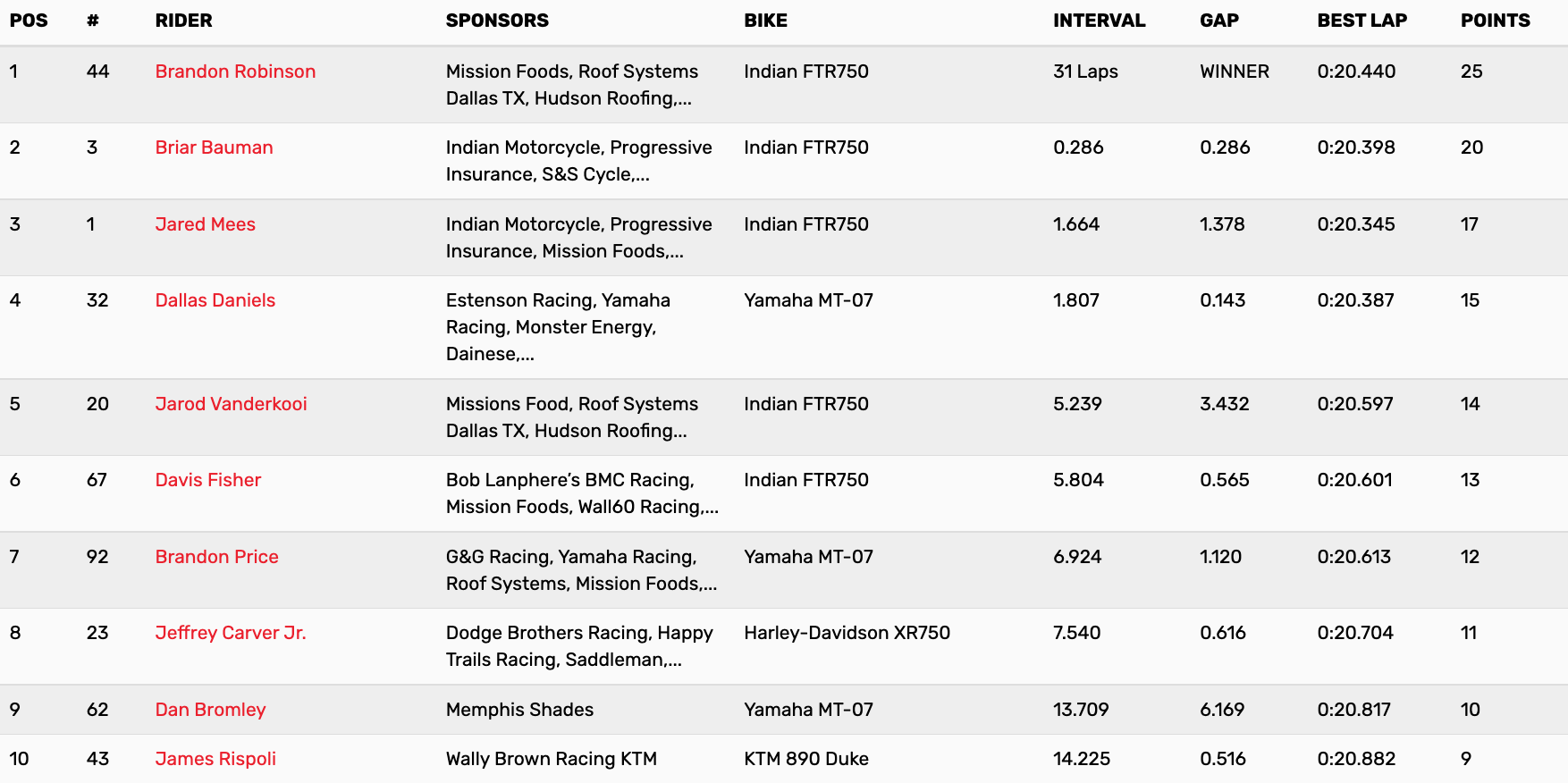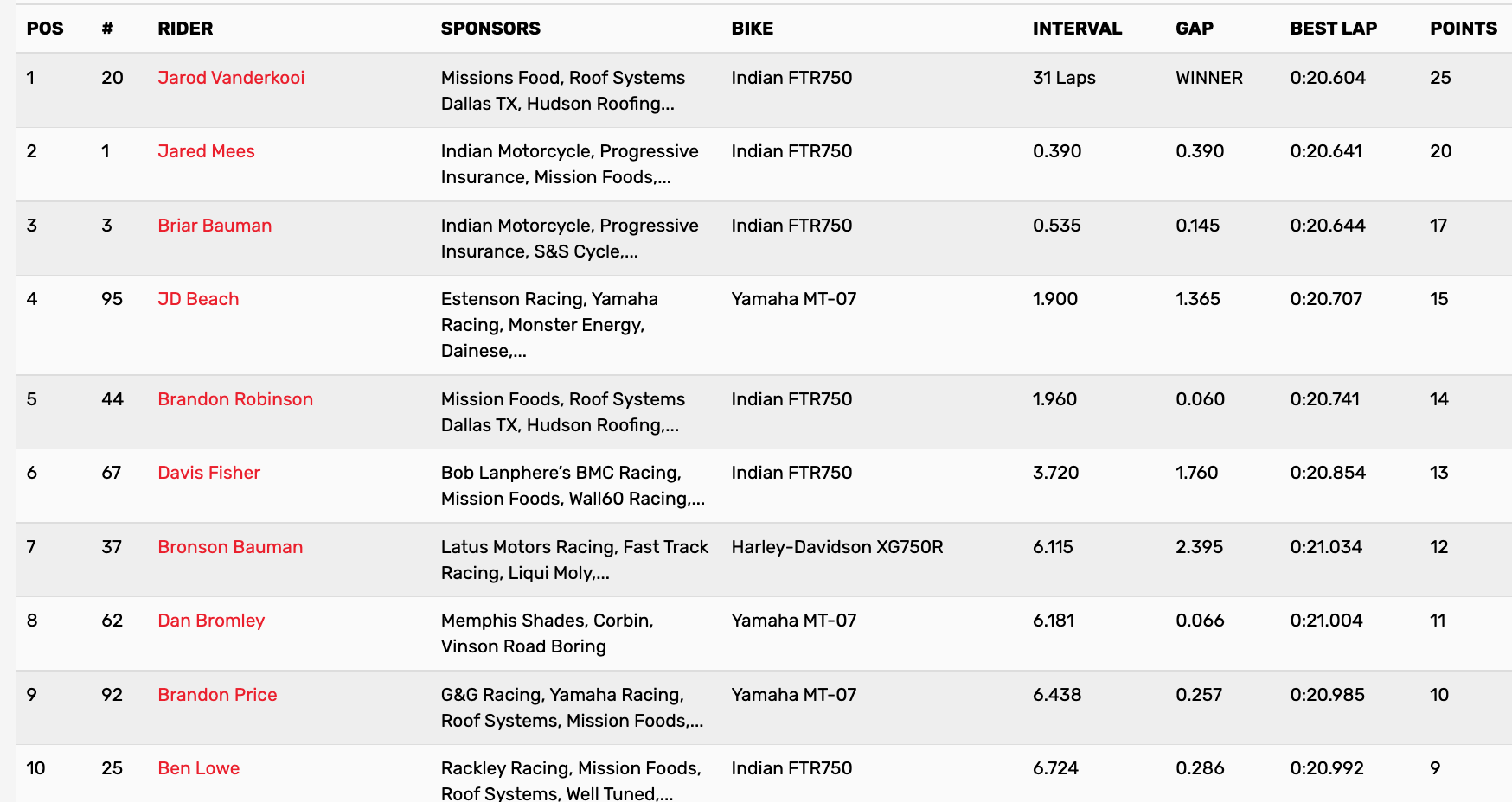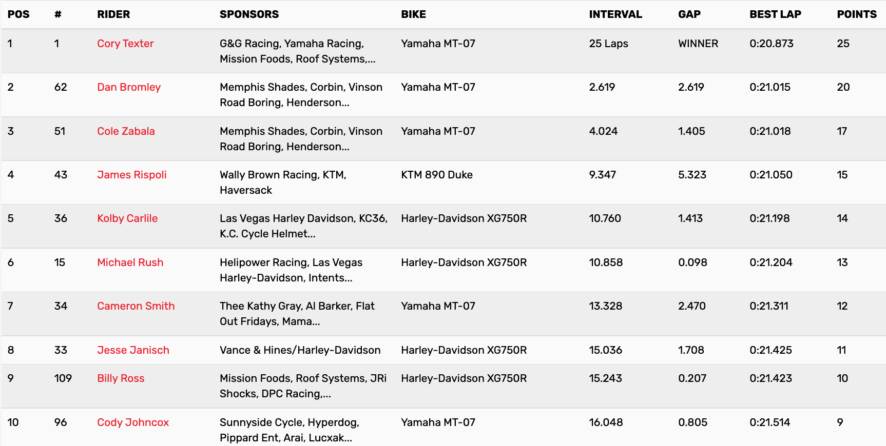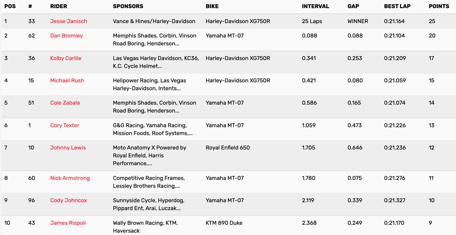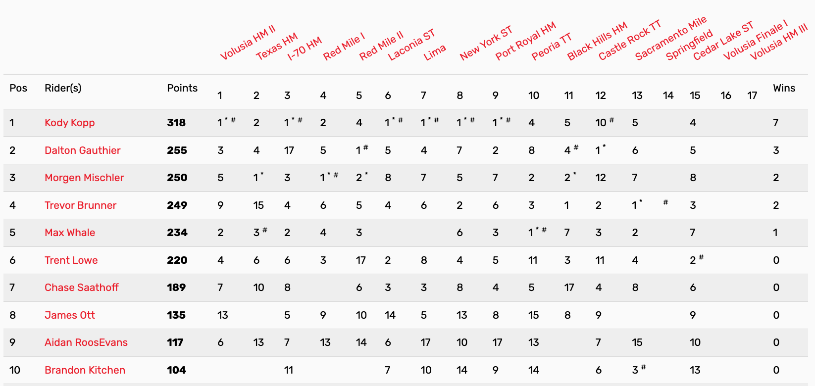 | Kody Kopp (KTM) | American Flat Track | AFT Production Twins |