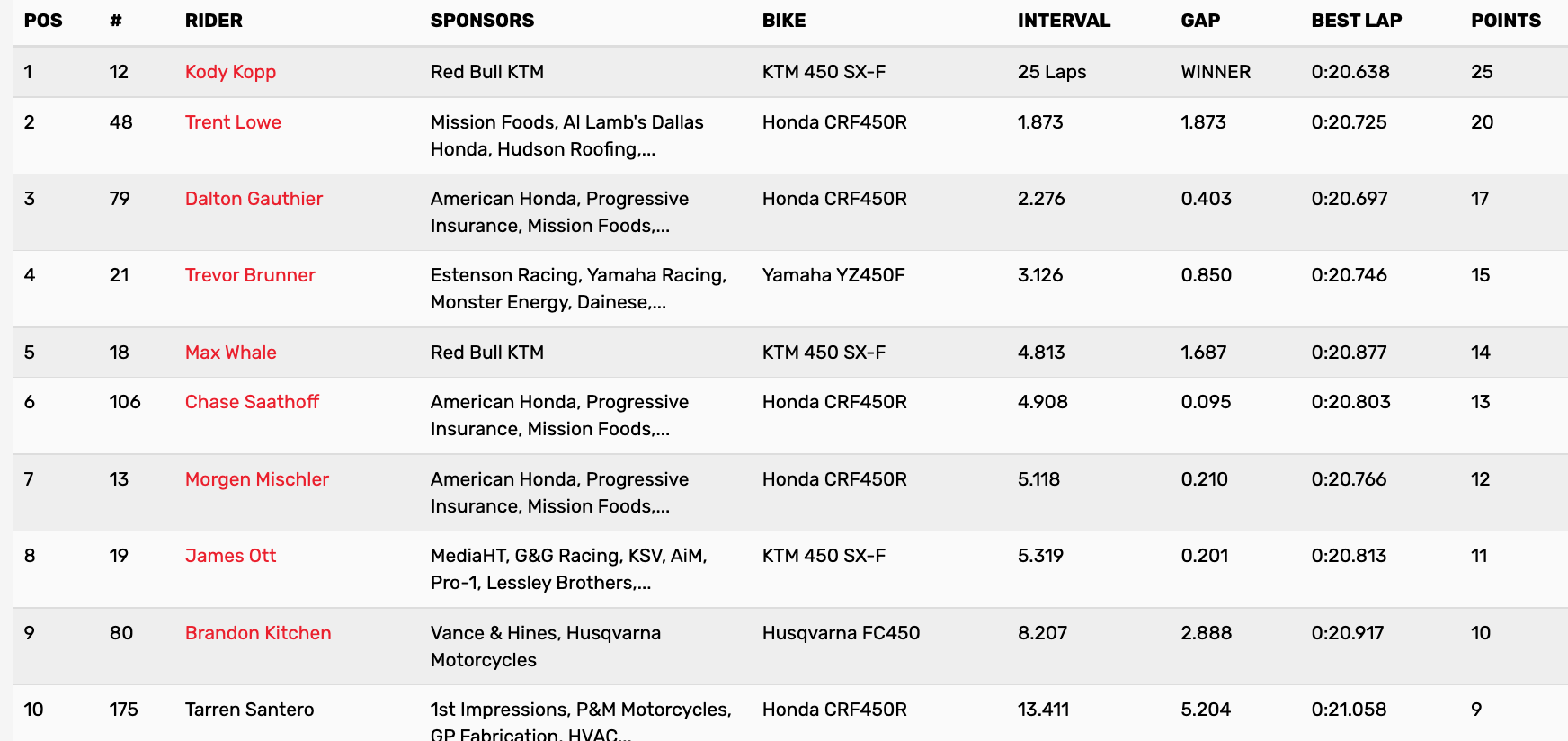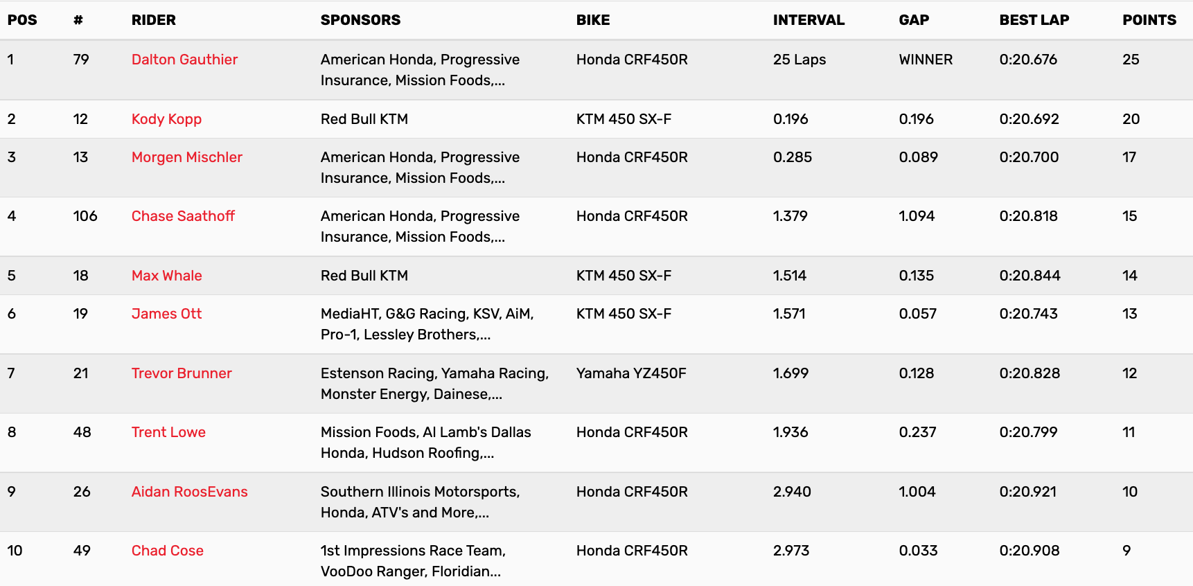 | Carson Brown (KTM) | Red Bull Straight Rhythm | 125/150cc |