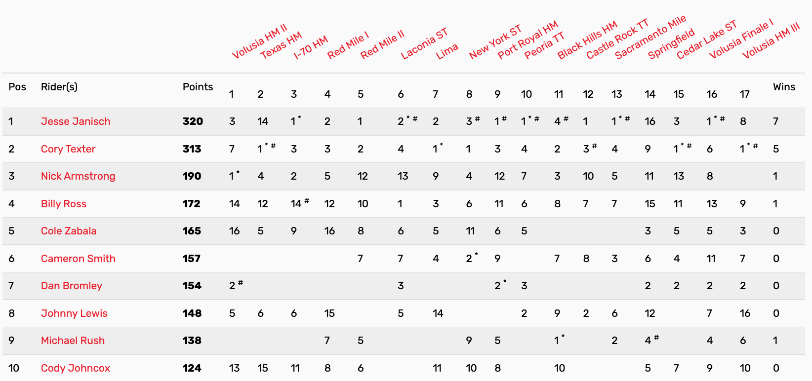 | Jesse A. Janisch (Harley-Davidson) | American Flat Track | AFT Singles |