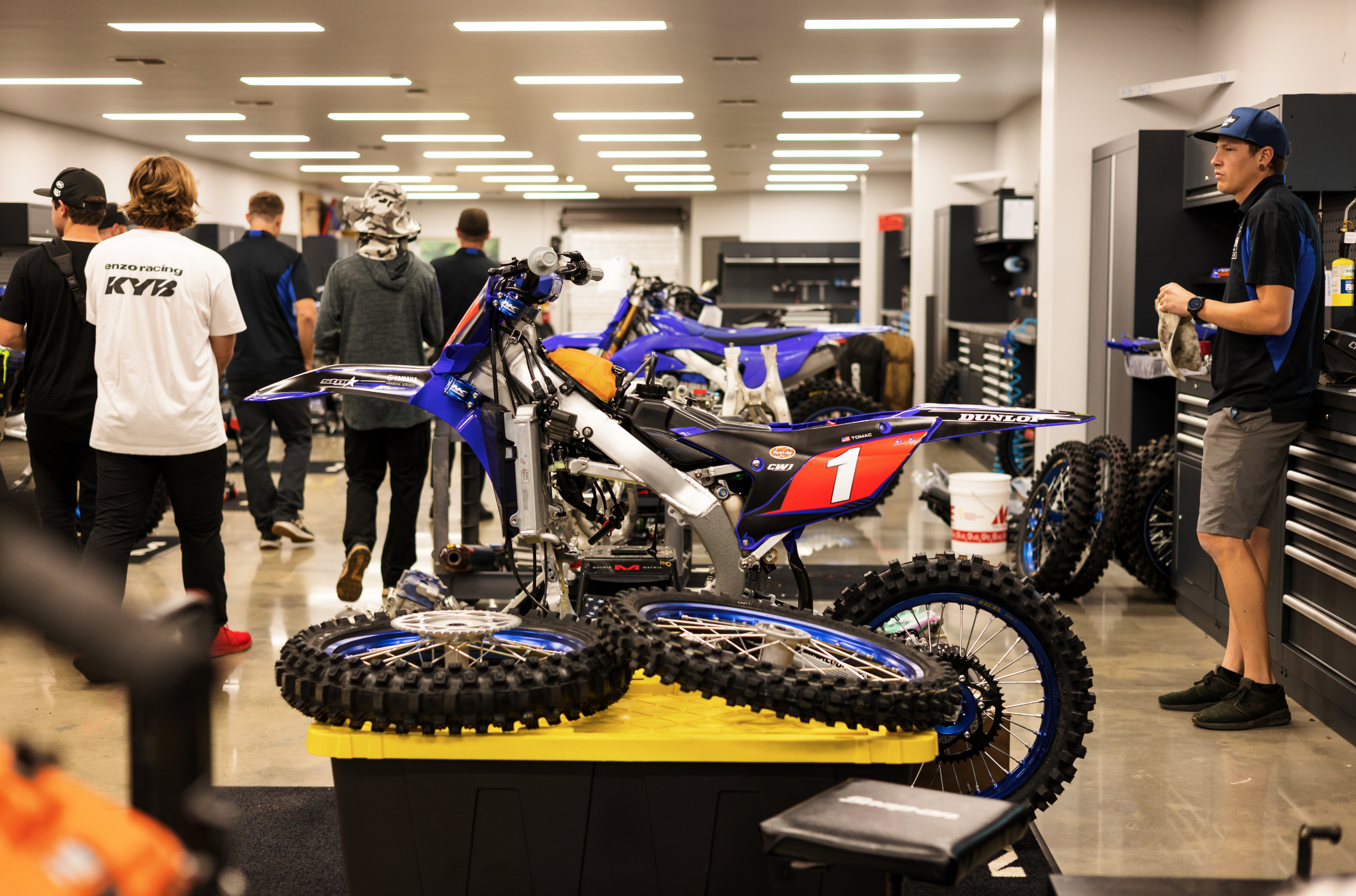 Once the 2023 presentation was over, Jeremy Coker (Monster Energy Yamaha Star Racing’s Team Manager) walked us around the whole facility and showed us around each individualized area. There is a 11 man/rider work bays for the mechanics, an engine room, suspension room, 250/450 parts room, upstairs office area, lounge as well as a championship bike room that was really cool. We also got to shoot all of our static shots that evening so we could dedicate the following day to testing. The shop is pristine and is well taken care of. We did NOT want to track mud inside the doors and for that reason, the riders even have their own locker room. This is kind of similar to Aldon’s Baker’s Factory but not quite as strict on riding on the grass between the driveways. The GOAT Farm is a little more chill…