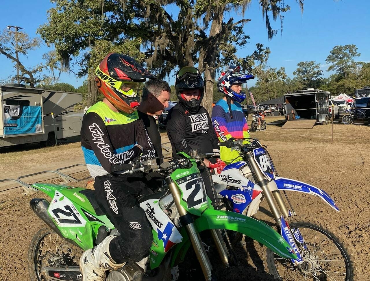 My friend Larry Hughes is a longtime Texas moto enthusiast and industry member. He's currently a regional sales manager for Stark Electric Motorcycles. He sent me an email with a couple of photos taken 50 years apart at the Rio Bravo track in Houston, Texas. The first is a black-and-white photo taken at the 1972 Trans-AMA featuring Ake Jonsson (27) and Heikki Mikkola (10) and "Bad" Brad Lackey (standing) on the starting line before a race that Jonsson would win. The color photo was taken this weekend, fifty years later, of Ethan Hughes, TJ Hughes and Landen Summerlin on the starting line at Rio Bravo in Houston before practice at the 2022 AMA District 20 Championship Series. All three are members on Larry's team, FCA Motocross. Hughes added that Rio Bravo has the same basic layout since the '70s, with just a few more jumps, but that legendary dirt. Lining the two up is a cool way to compare motocross then and now.
