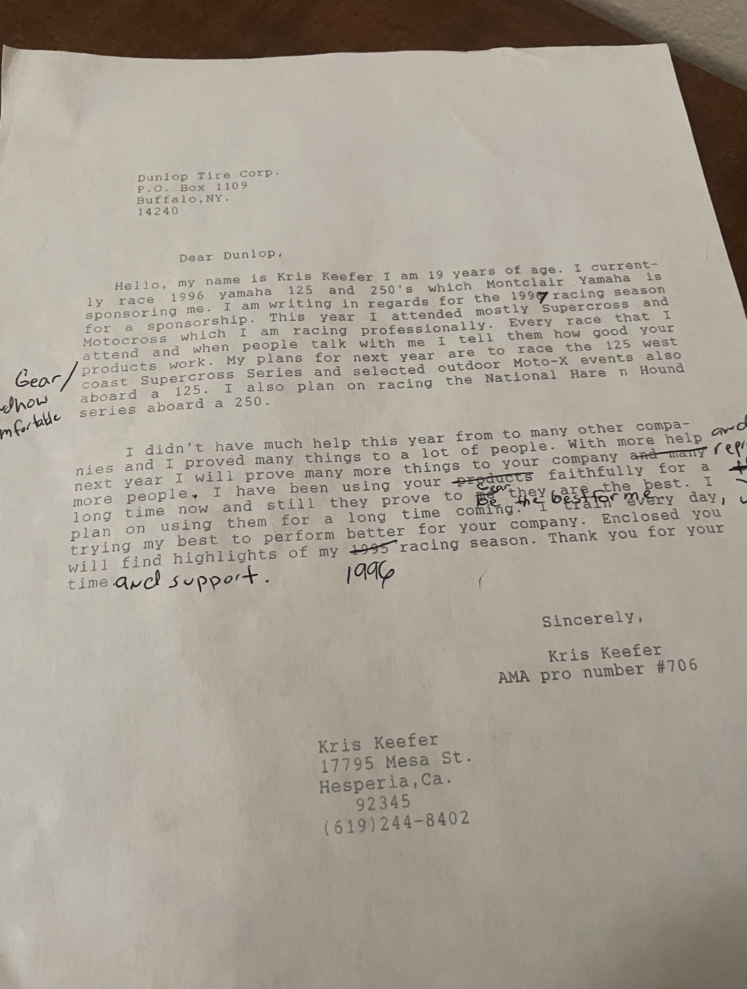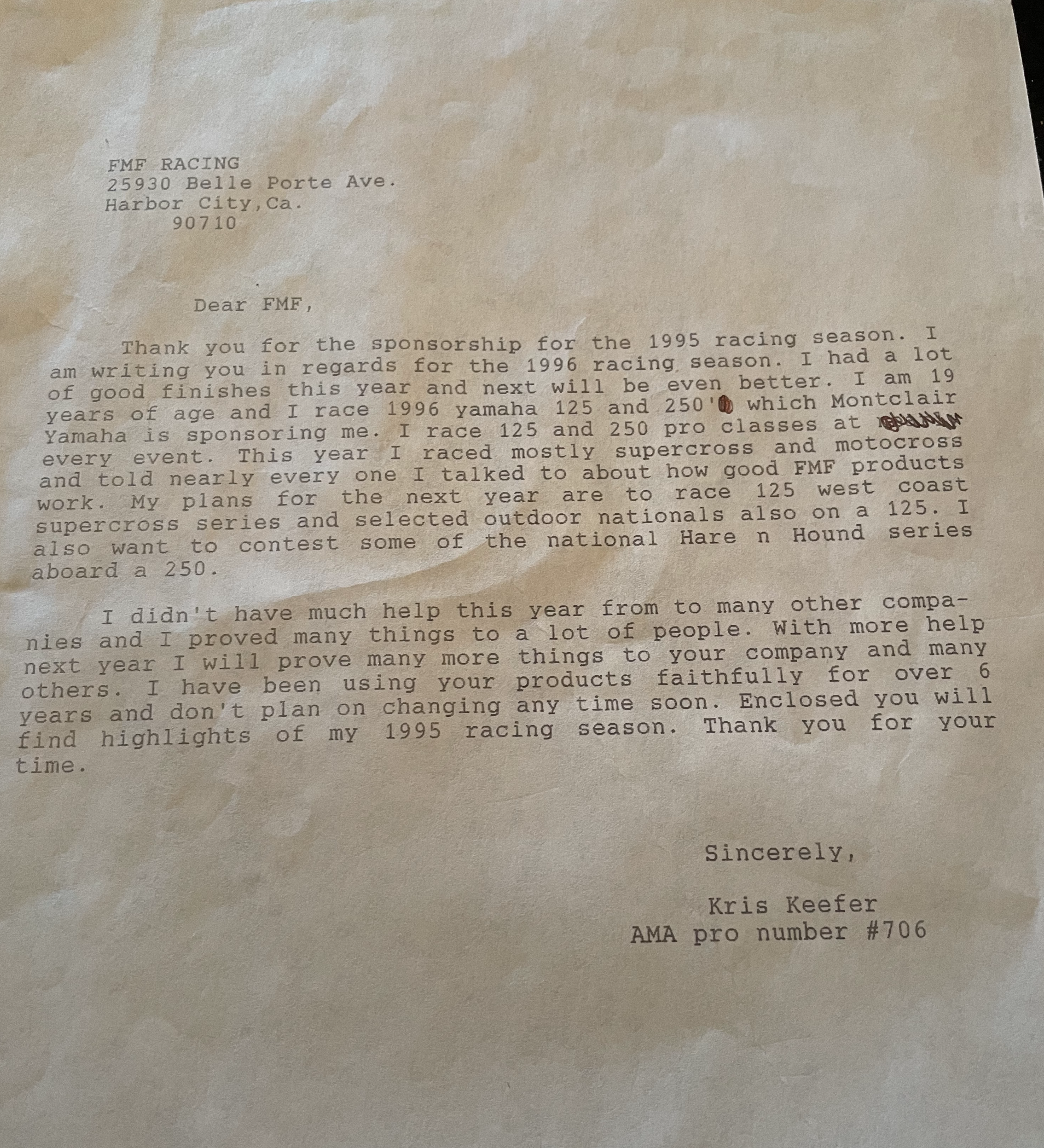 What was up in that attic was a majestic binder that had handwritten resumes, a company hit list, and even a note to grandma. I was either asking or thanking all of them for sponsorship. You see, when I was a young moto fiend teenager, I used to go through all of my motocross magazines and find as many addresses as I could from companies to see if they could offer any support for my upcoming racing season. I would first write a rough draft and then hand type them on the family typewriter (you kids, if you’re still here, don’t know anything about that). After typing a letter and some results, I would lick more than few envelopes and send them off. The next few weeks, maybe months, were all about waiting by the mailbox! I knew what time the mailman came and when he was late, I would freak out! I remember walking to the mailbox from the front door of the house envisioning a big/thick manilla envelope from Fox Racing that said, 'Congrats, you have been chosen to be a Fox Racing support rider,' but that letter never came. I didn’t even get a letter that said, 'Beat it, kid!'