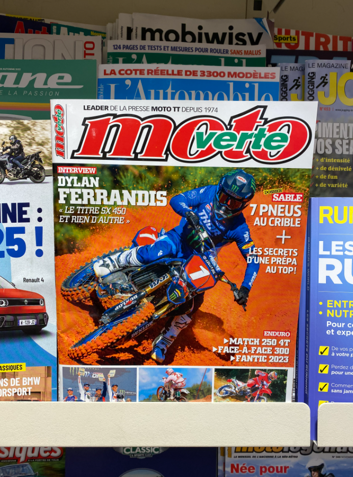 Passing through the Gare de Lyon train station in Paris, I noticed a couple of interesting moto magazine covers. First, there was this Moto Verte (published by the founders of the Paris Supercross) which featured a very rare shot of Dylan Ferrandis with the #1 plate on his Monster Energy Yamaha Star Racing YZ450F. Of course Dylan was hurt just before the start of his title defense in '22 and didn't get many races win with #1 on the bike (and never with the red plate of the points leader).