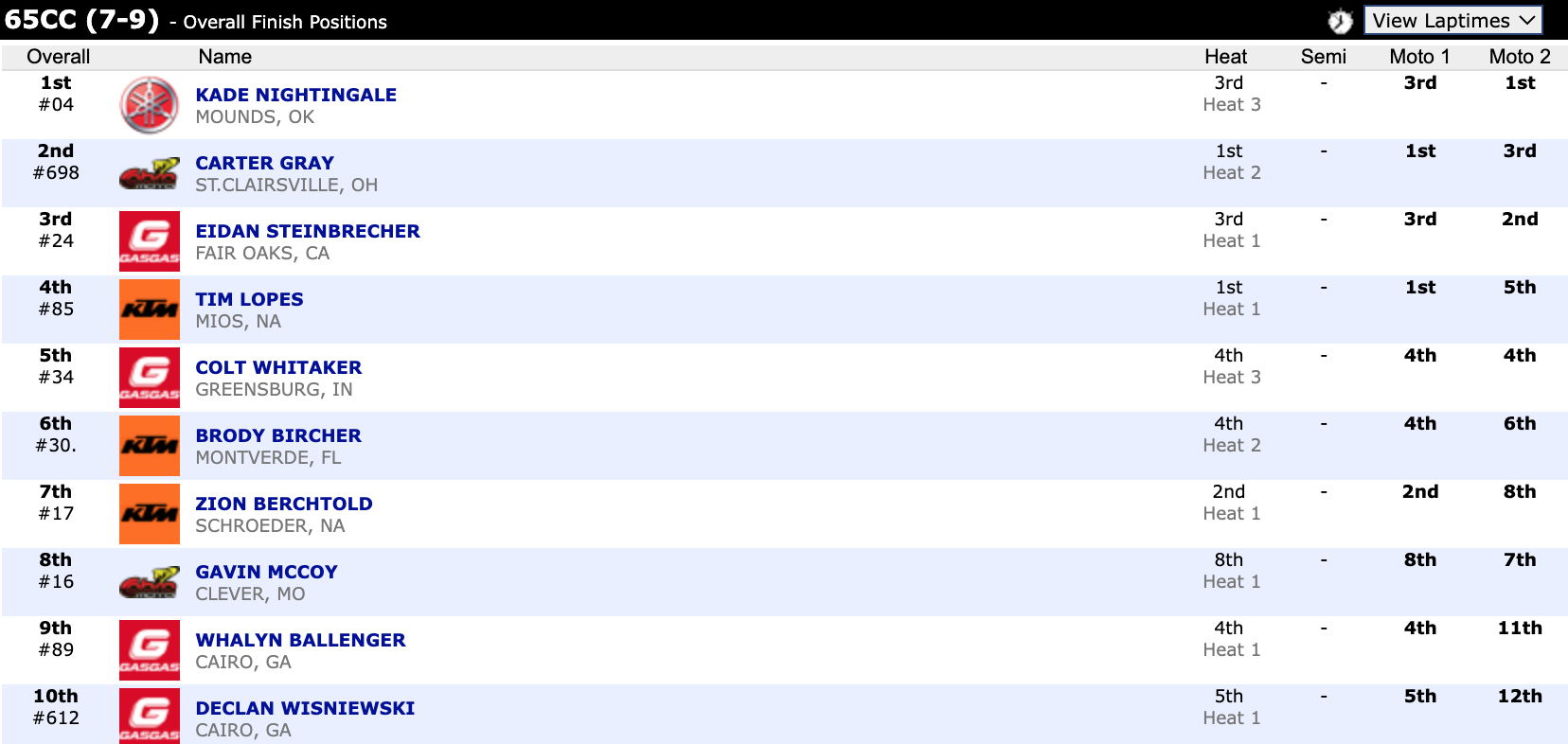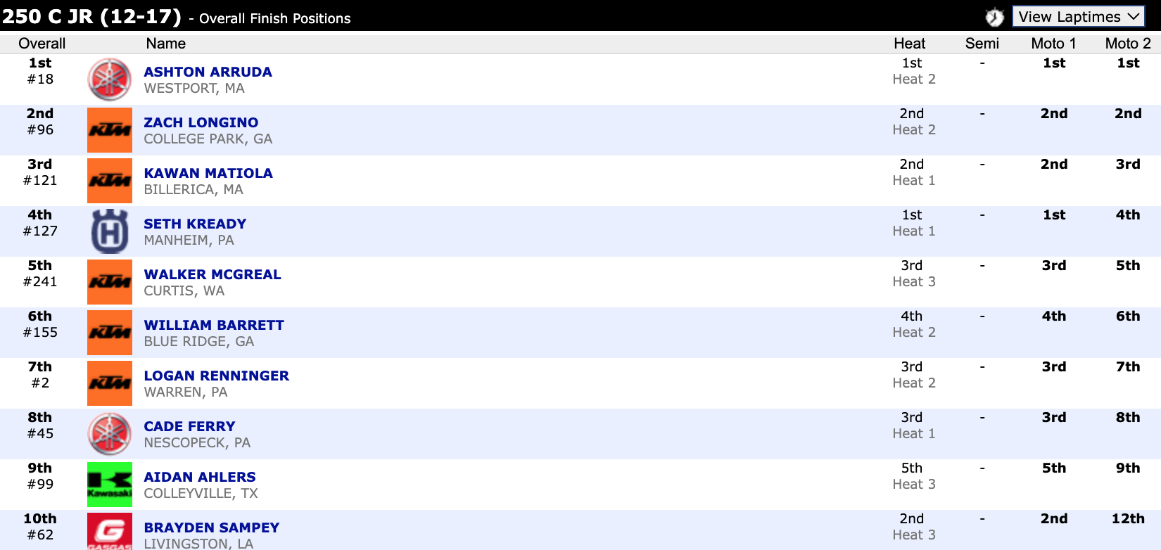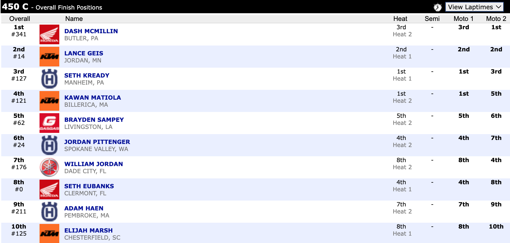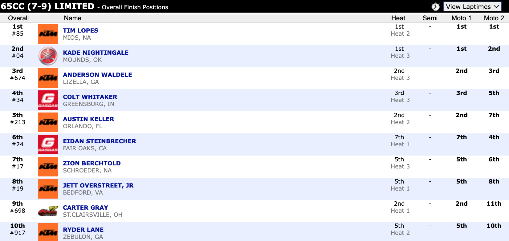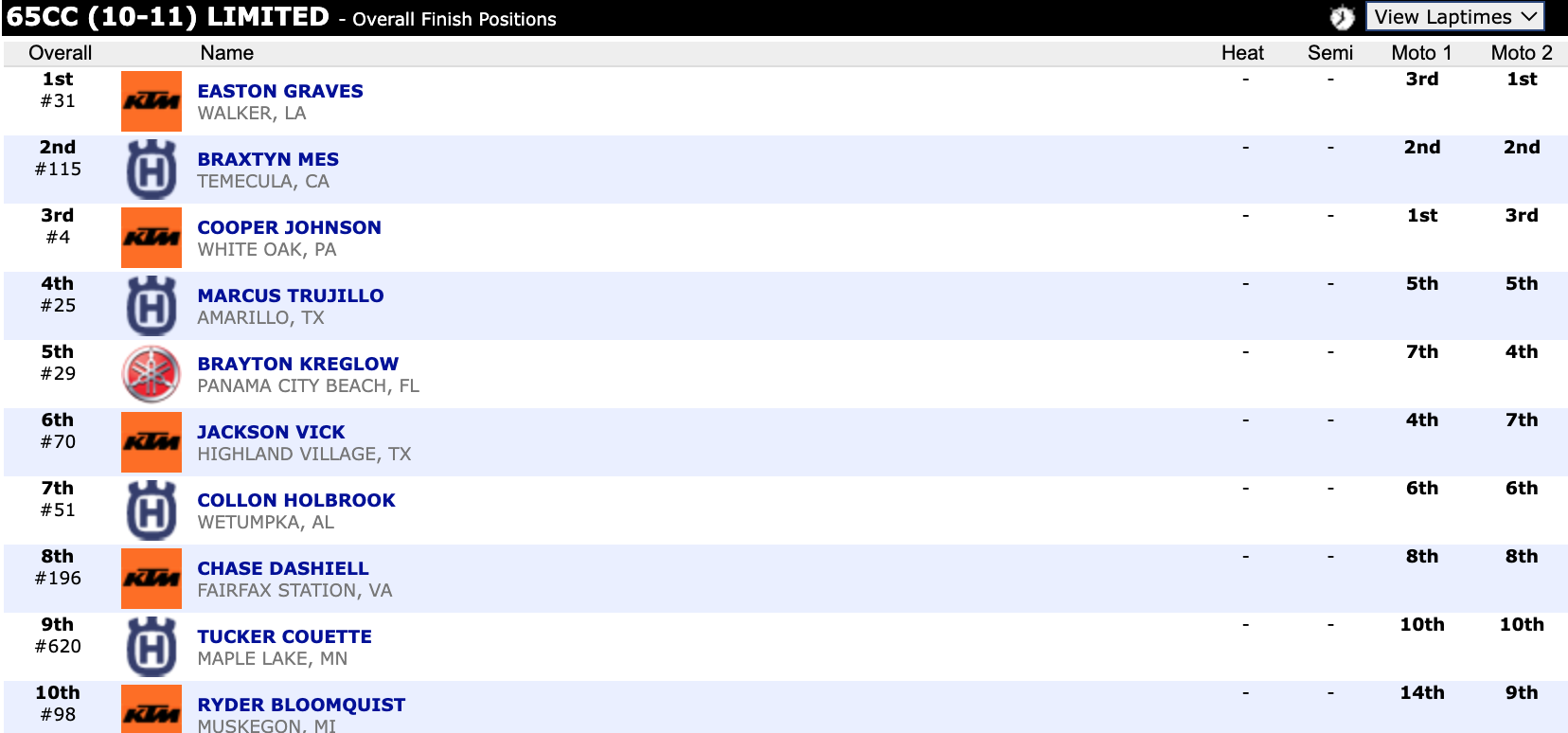 Here are the top ten overall motocross finishes from each class. To view the full results, visit http://resultsmx.com/minio/class.asp?c=all&e=236&s=.