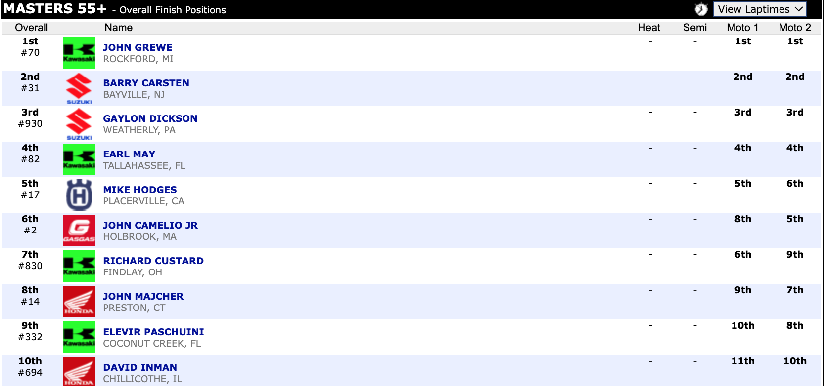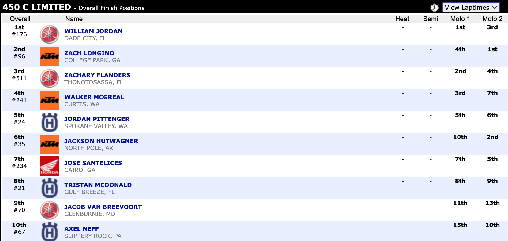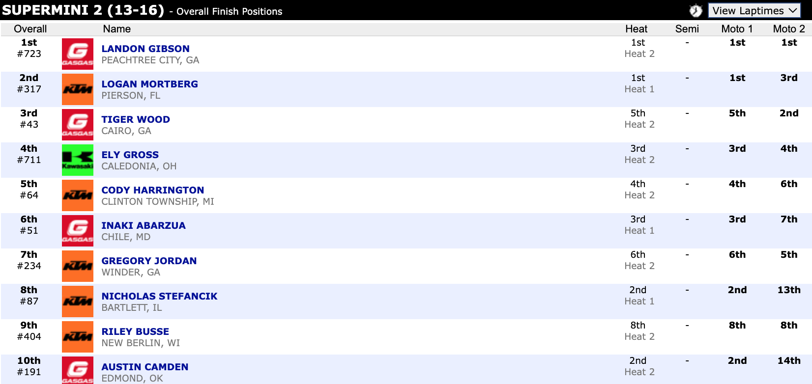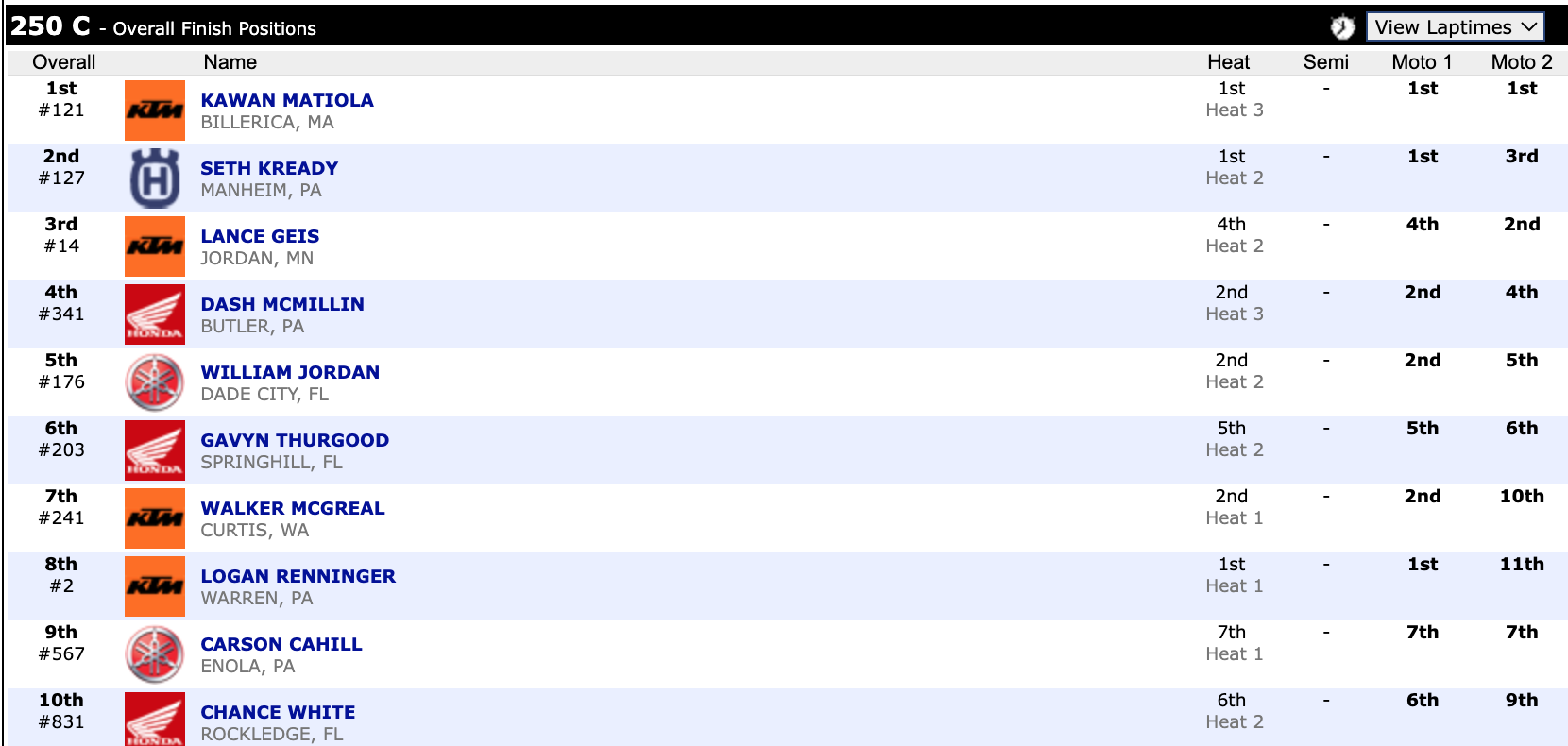 Here are the top ten overall motocross finishes from each class. To view the full results, visit http://resultsmx.com/minio/class.asp?c=all&e=236&s=.