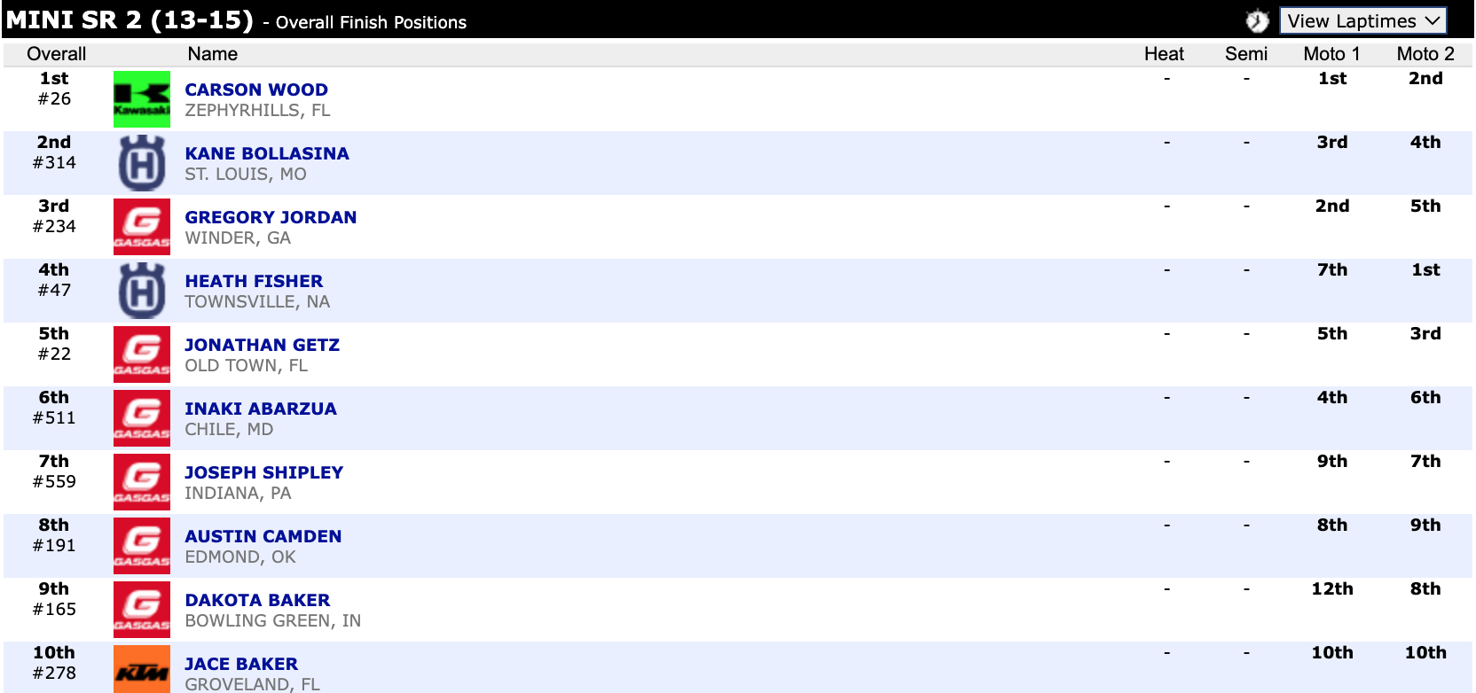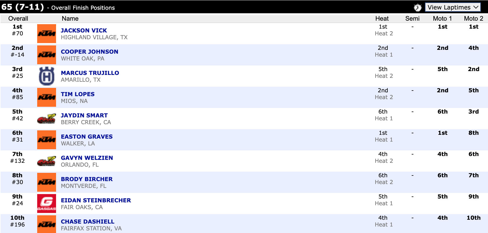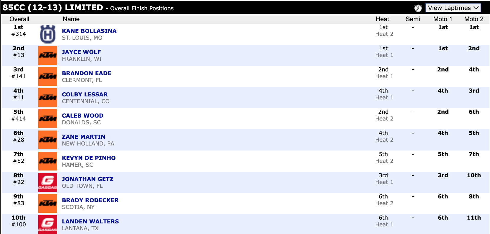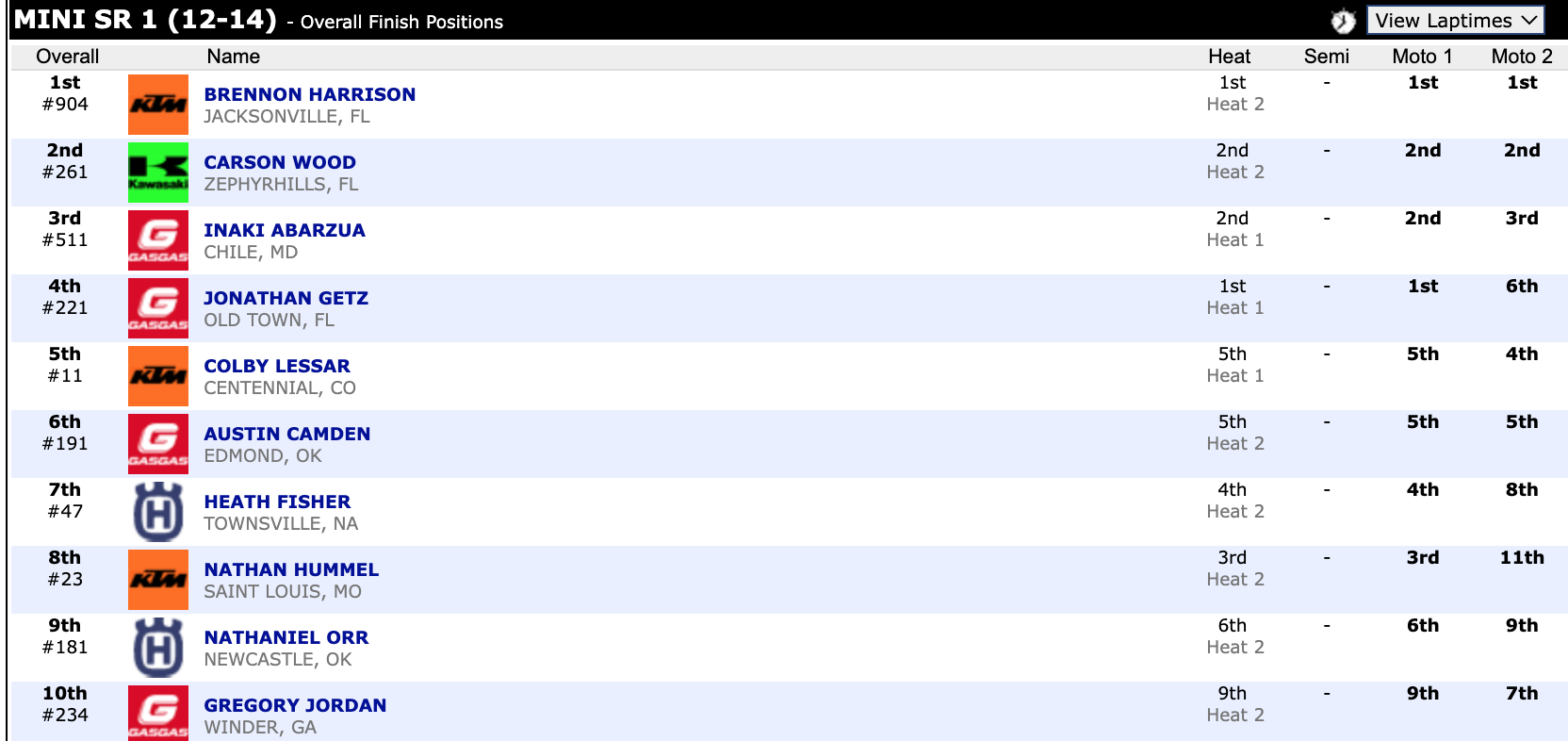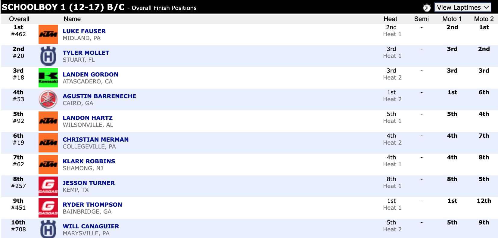 Here are the top ten overall motocross finishes from each class. To view the full results, visit http://resultsmx.com/minio/class.asp?c=all&e=236&s=.