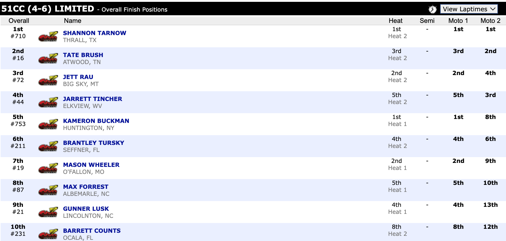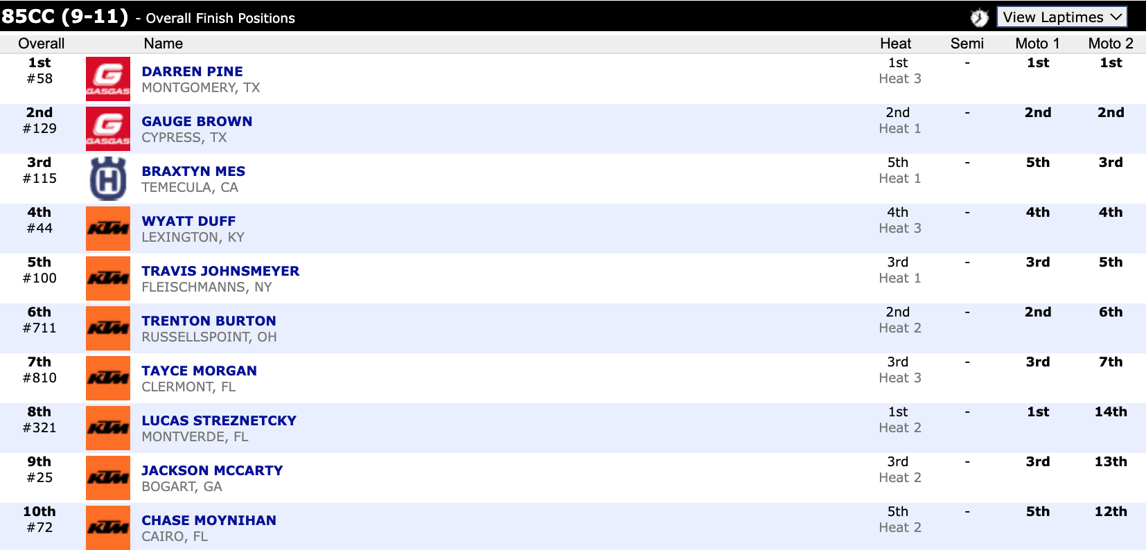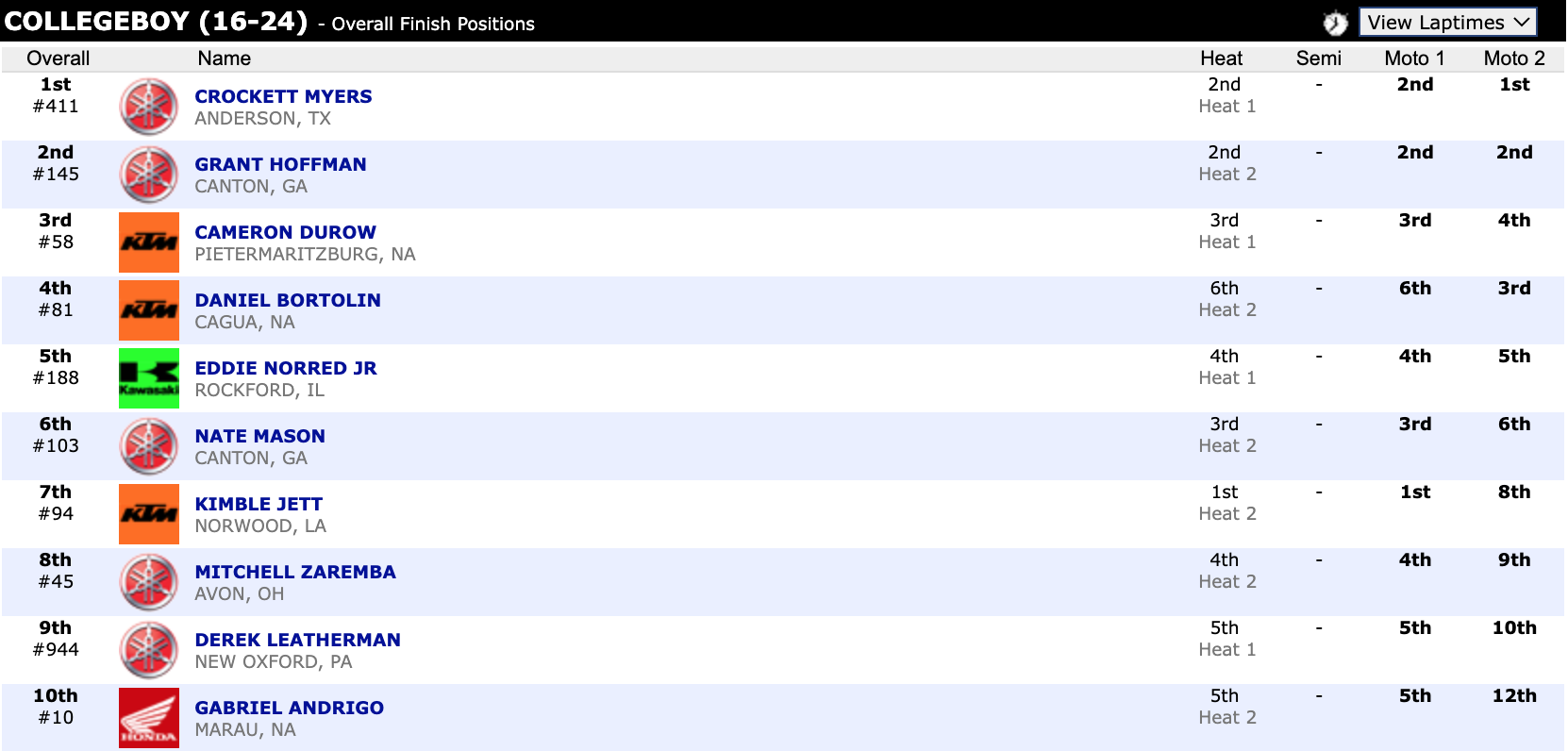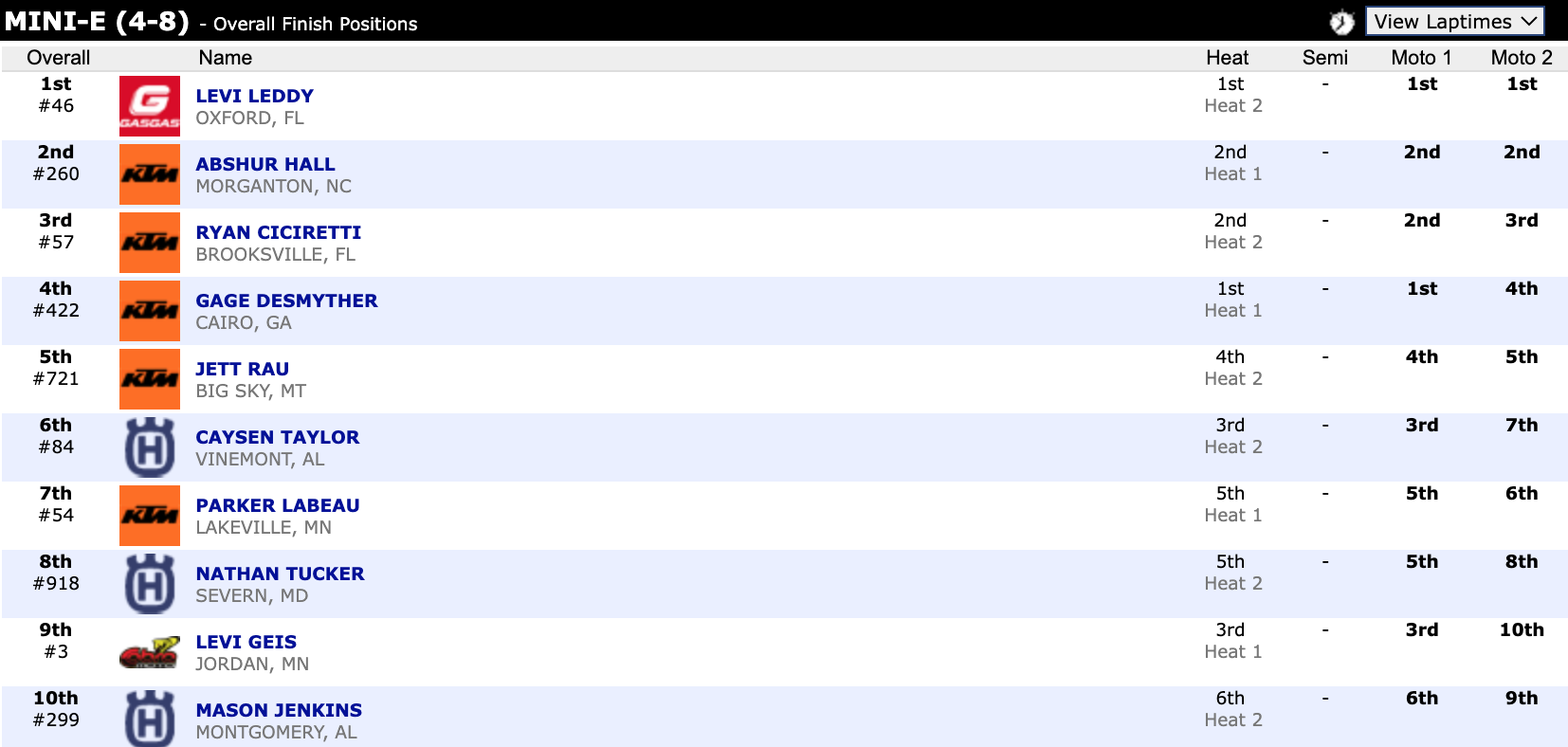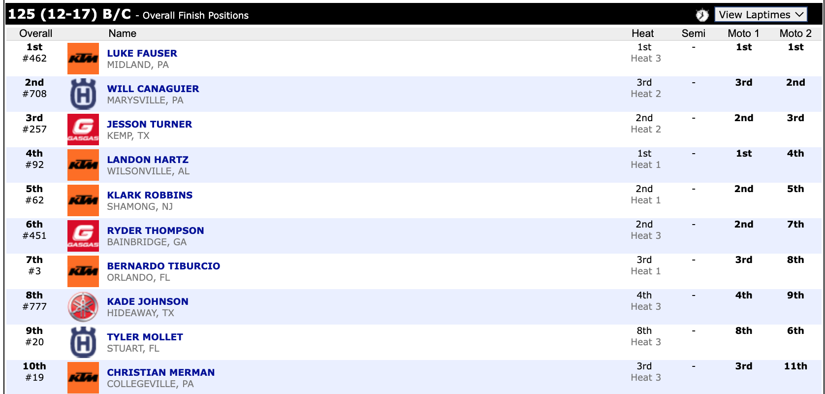 Here are the top ten overall motocross finishes from each class. To view the full results, visit http://resultsmx.com/minio/class.asp?c=all&e=236&s=.