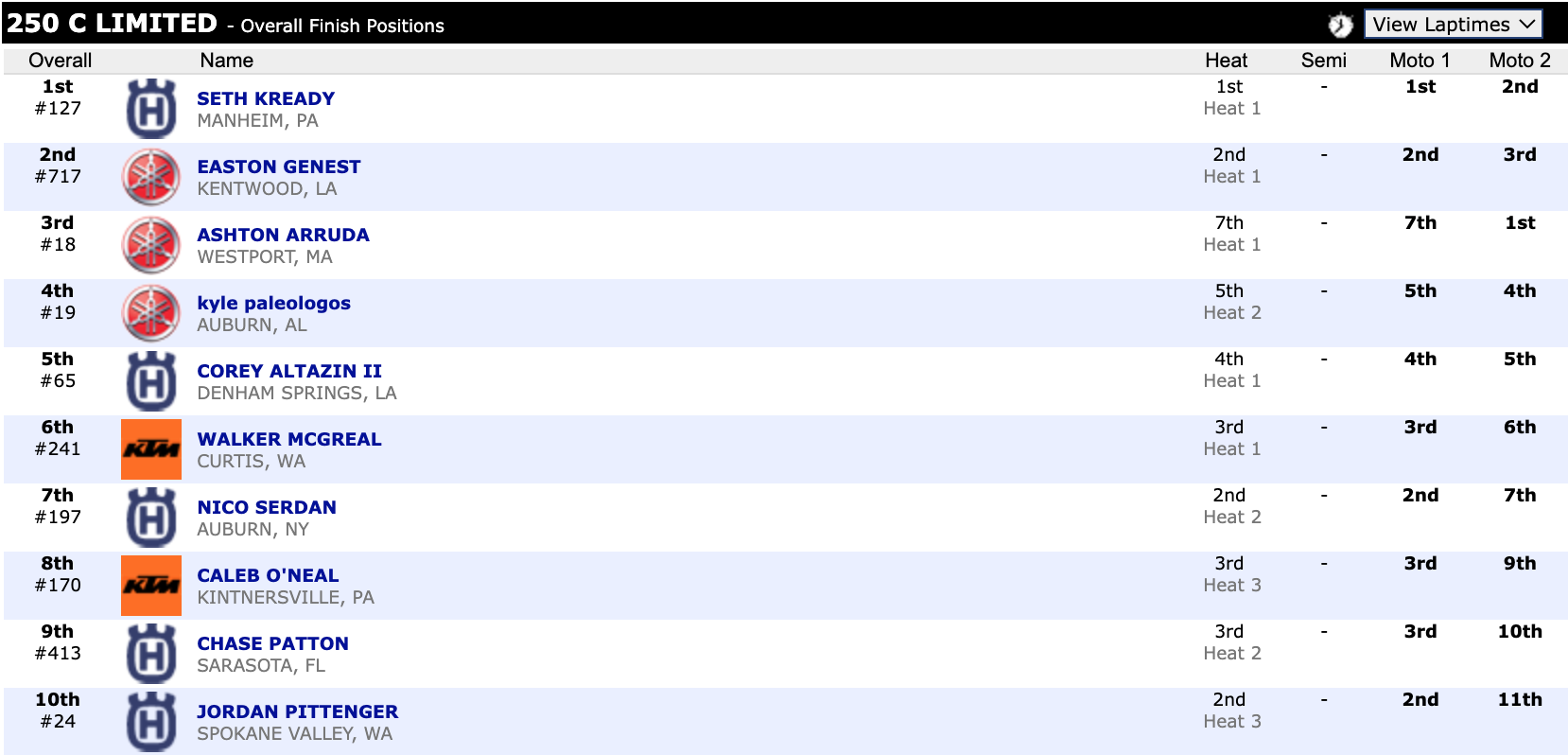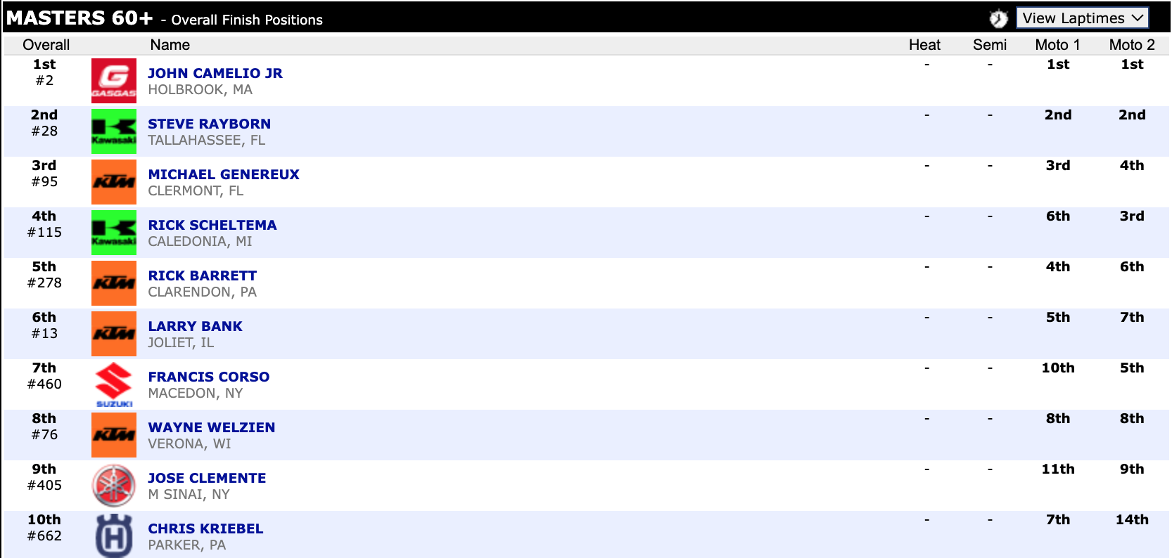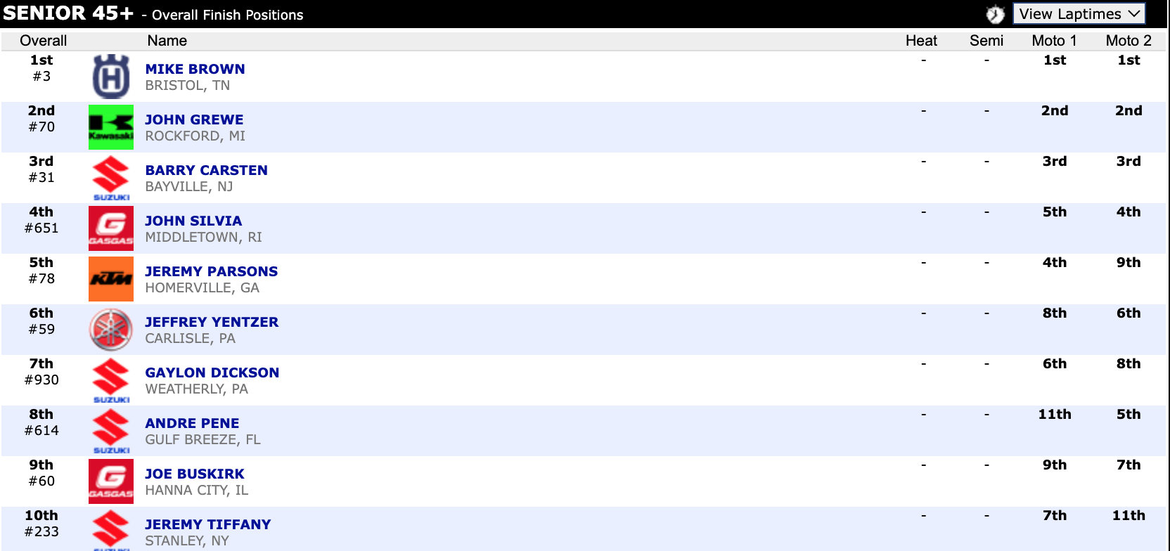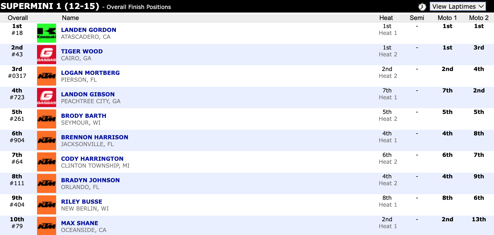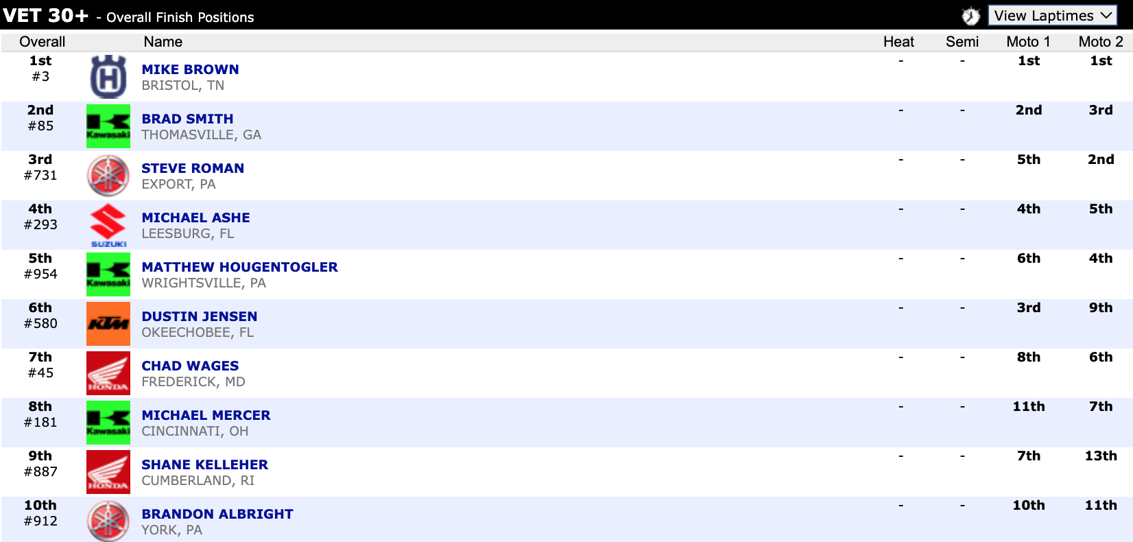 Here are the top ten overall motocross finishes from each class. To view the full results, visit http://resultsmx.com/minio/class.asp?c=all&e=236&s=.
