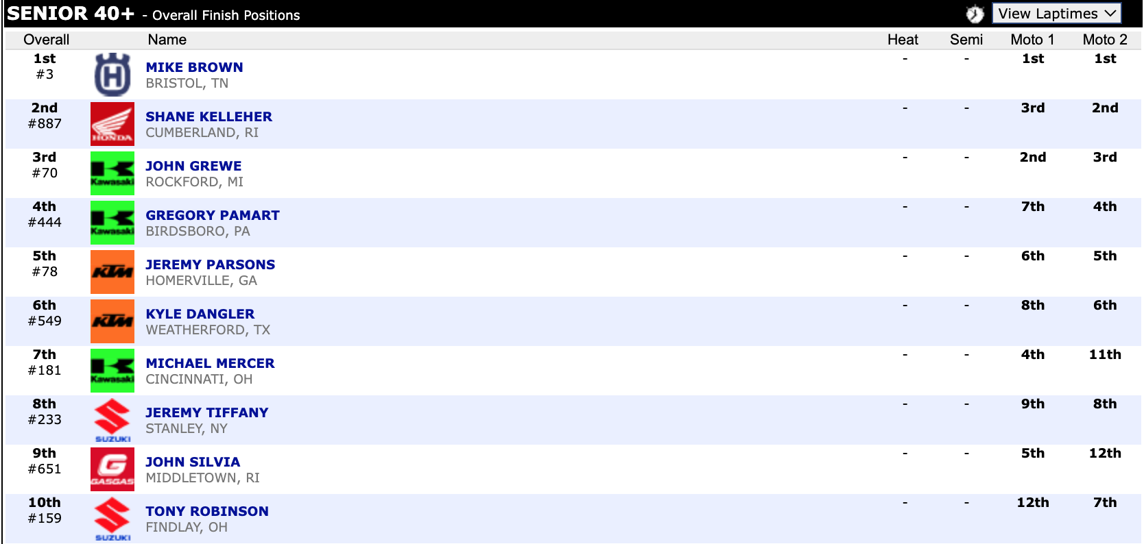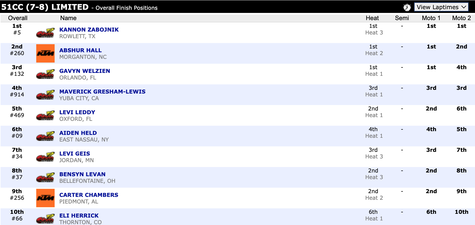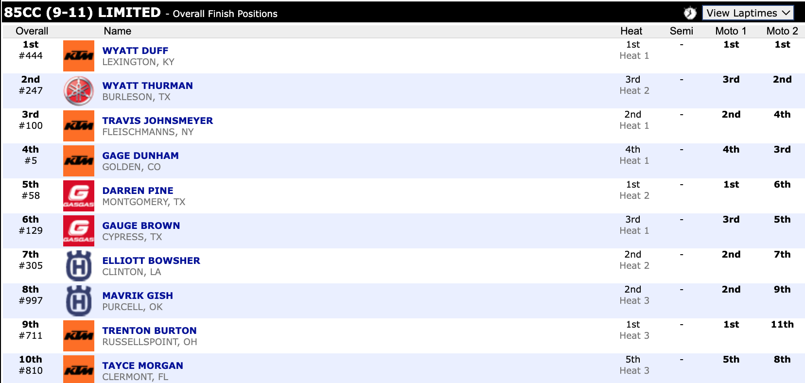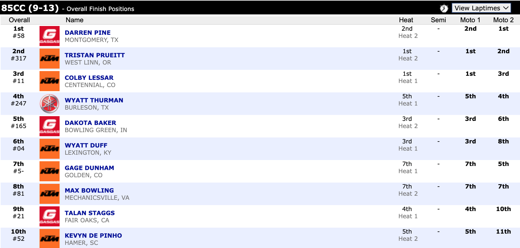 Here are the top ten overall motocross finishes from each class. To view the full results, visit http://resultsmx.com/minio/class.asp?c=all&e=236&s=.