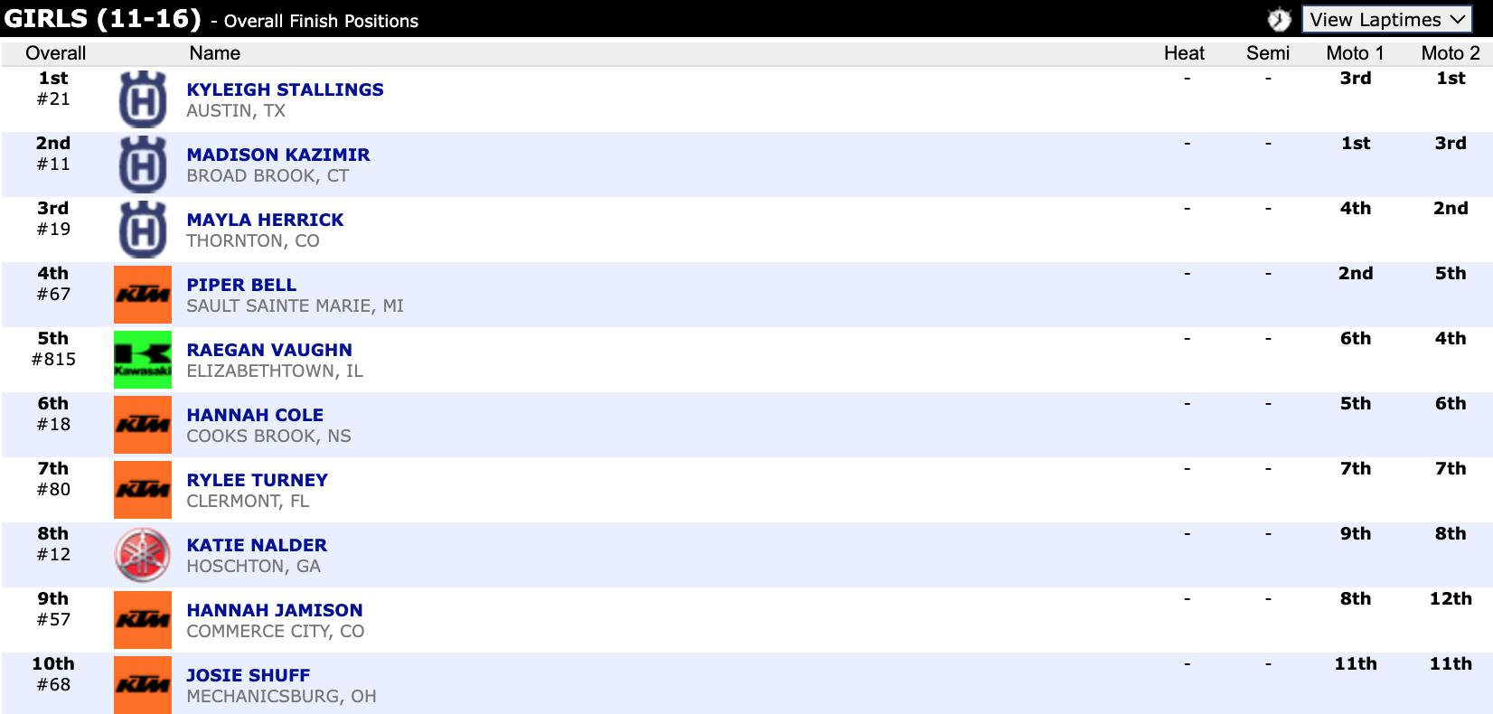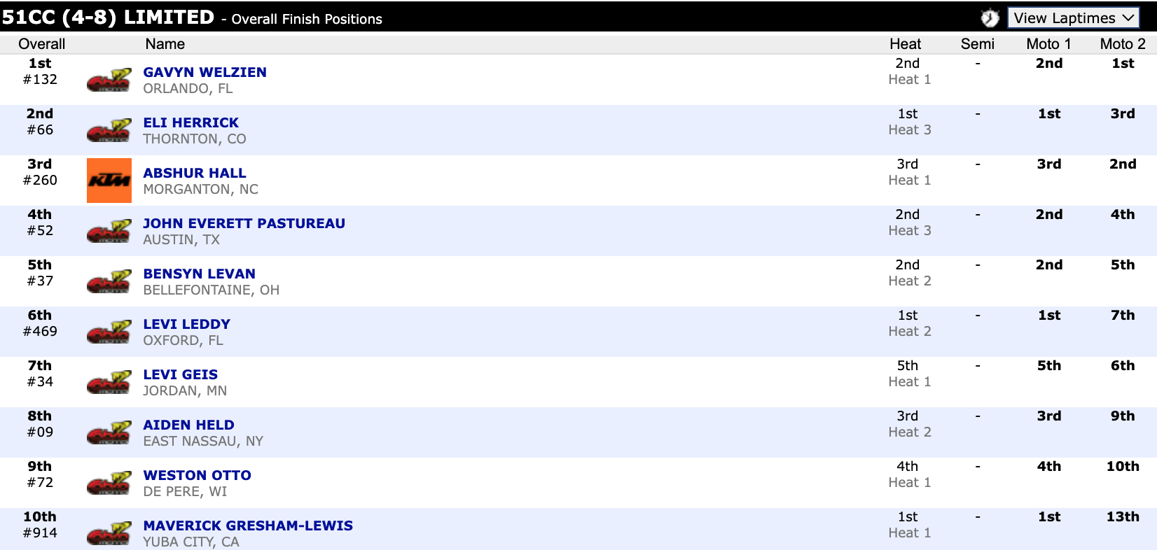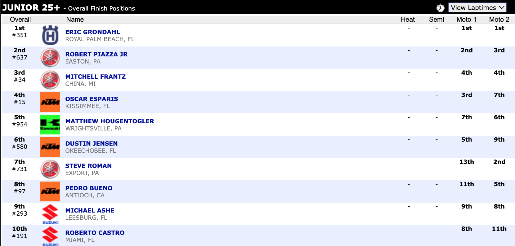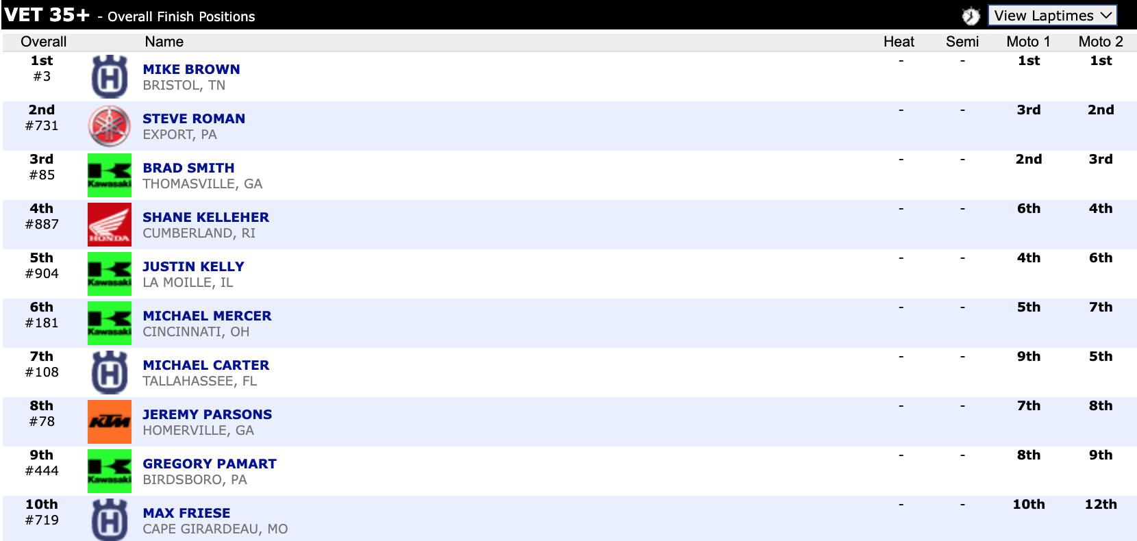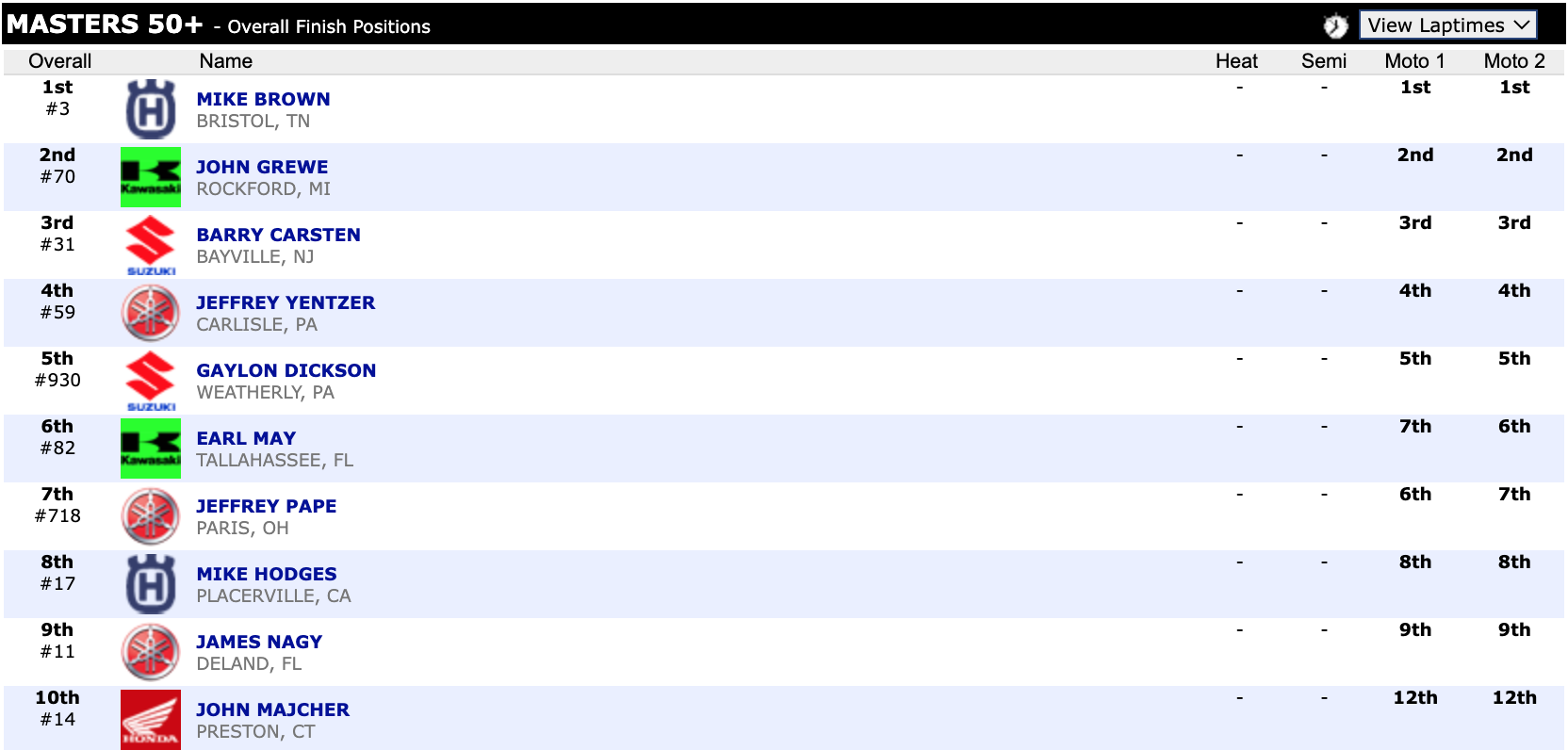 Here are the top ten overall motocross finishes from each class. To view the full results, visit http://resultsmx.com/minio/class.asp?c=all&e=236&s=.