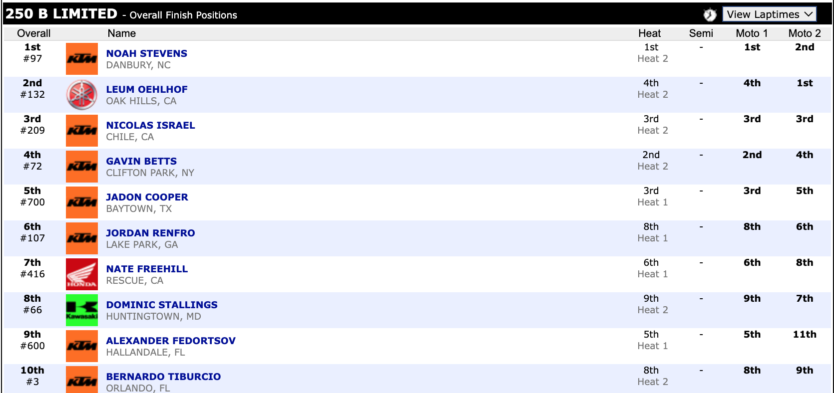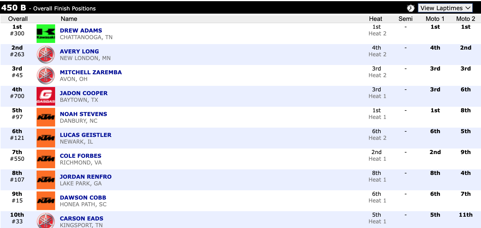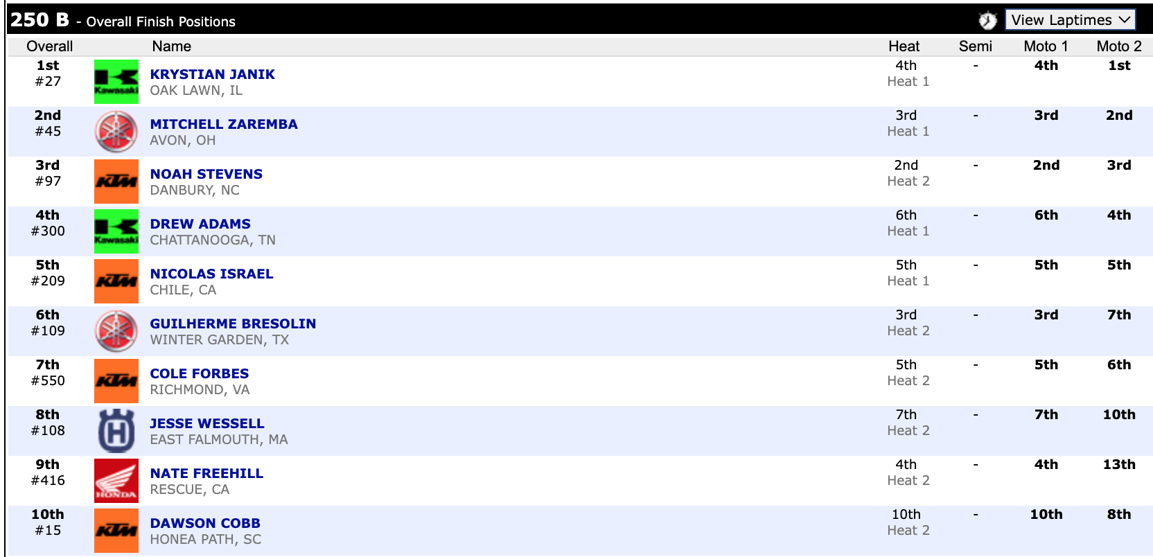 Check out the top ten overall finishers in supercross.