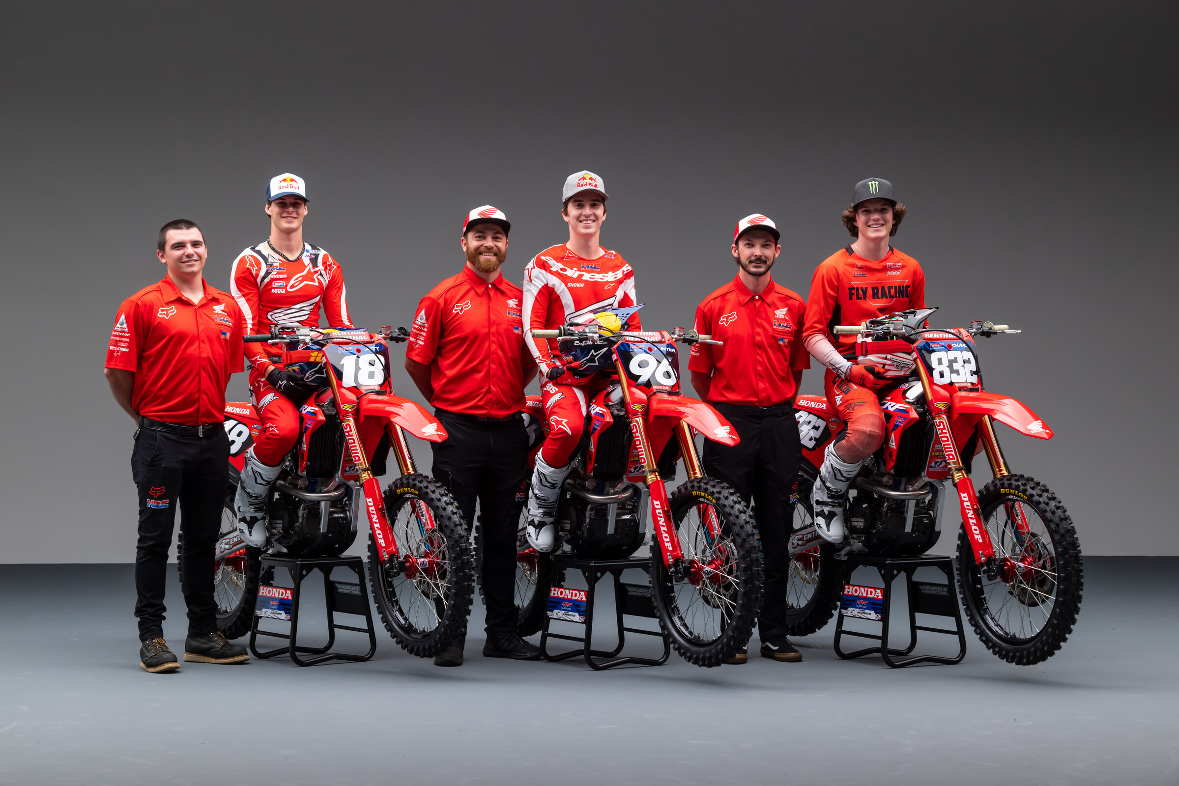For the third year in a row, Team Honda HRC's 250 effort is headed up by Australian brothers Hunter and Jett Lawrence, both campaigning the CRF250R. This past season saw Jett not only successfully defend his AMA Pro Motocross 250 title, but also earn the AMA Supercross 250SX East Region crown, while Hunter was second in the West Region and third outdoors. For 2023, the brothers are swapping supercross regions, with Jett riding West and Hunter racing East. Meanwhile, Chance Hymas advances from the amateur ranks to join Hunter in selected East Region appearances.