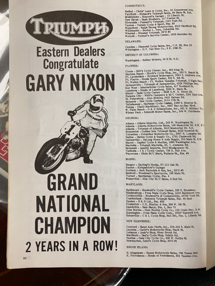 And if you look in the Racer X Vault for results in AMA Supercross and AMA Pro Motocross, you will find several British motorcycles in the results. What you won't find, however, are any Triumphs. Nor will you find a British bike in the results after 1973, when the Japanese brands really began to take over with the introduction of the Honda CR250M Elsinore. Most prominent are AJS riders (A.J. Stevens & Co.) In 1972 and '73 four different riders appear listed as riding AJS motorcycles: Bryar Holcomb, Morris Malone and Thomas Bragg in '72, and then Tom McGill in '73. The best finish for any of those guys was a solid sixth at the Cal-Expo National by Holcomb, who went on to more success on Suzuki, Maico and Bultaco. Bryan in now the owner of Factory Effex.