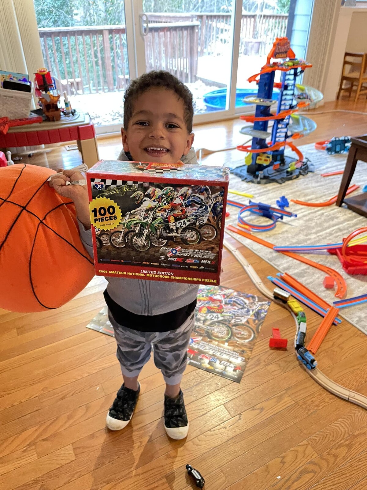 17 years ago while working at the Loretta Lynn Amateur Nationals, my friend Davey gave me this puzzle. I never opened it because I was set on giving it to my child one day. It moved with me to Idaho from Georgia, and to all 5 different houses I moved into out there and back to my house in Georgia and now at my current house. In some houses it was on display, others it was in a random box of stuff and yesterday my 3-year-old opened the puzzle. It was a bit warped from being stored in garages, etc, but it all came together! It’s crazy that this puzzle has traveled with me with the desire to have a baby always on my mind, and finally, 14 years after owning it, I brought Jack into this world… and today it was finally built! It was fun putting this puzzle together, together.