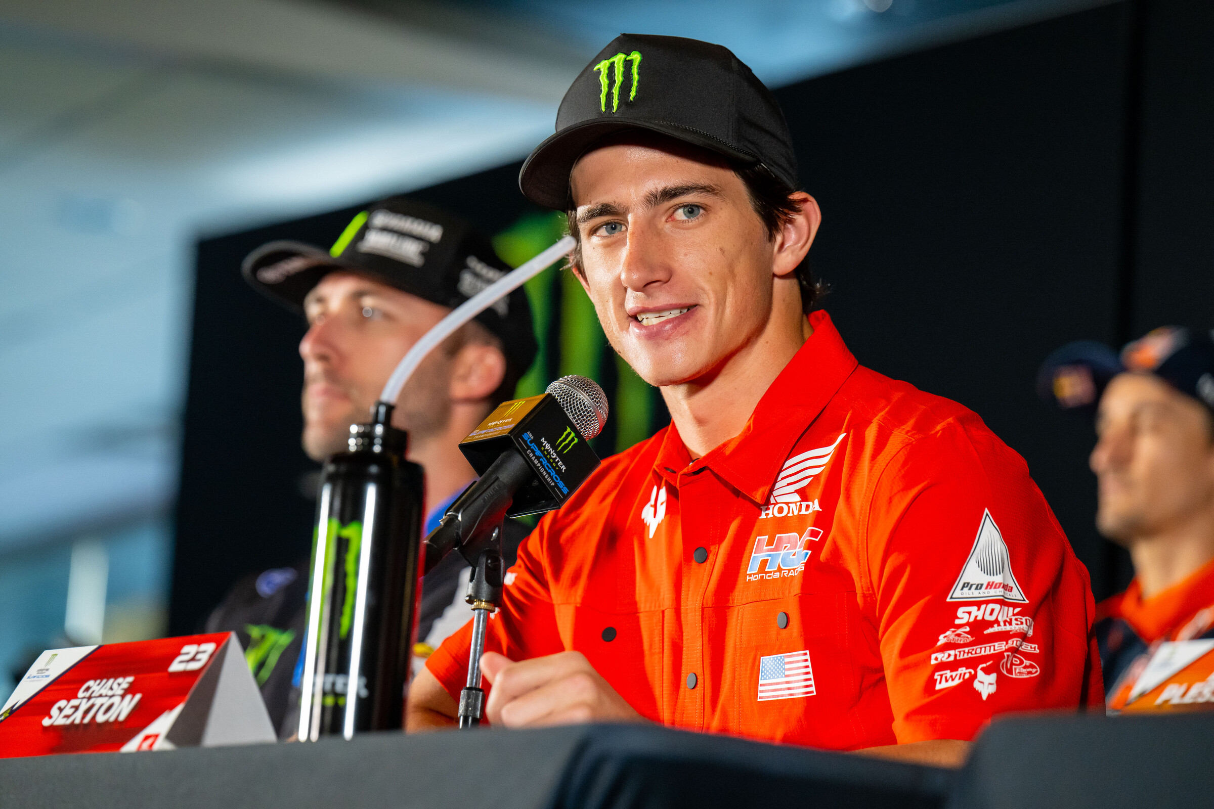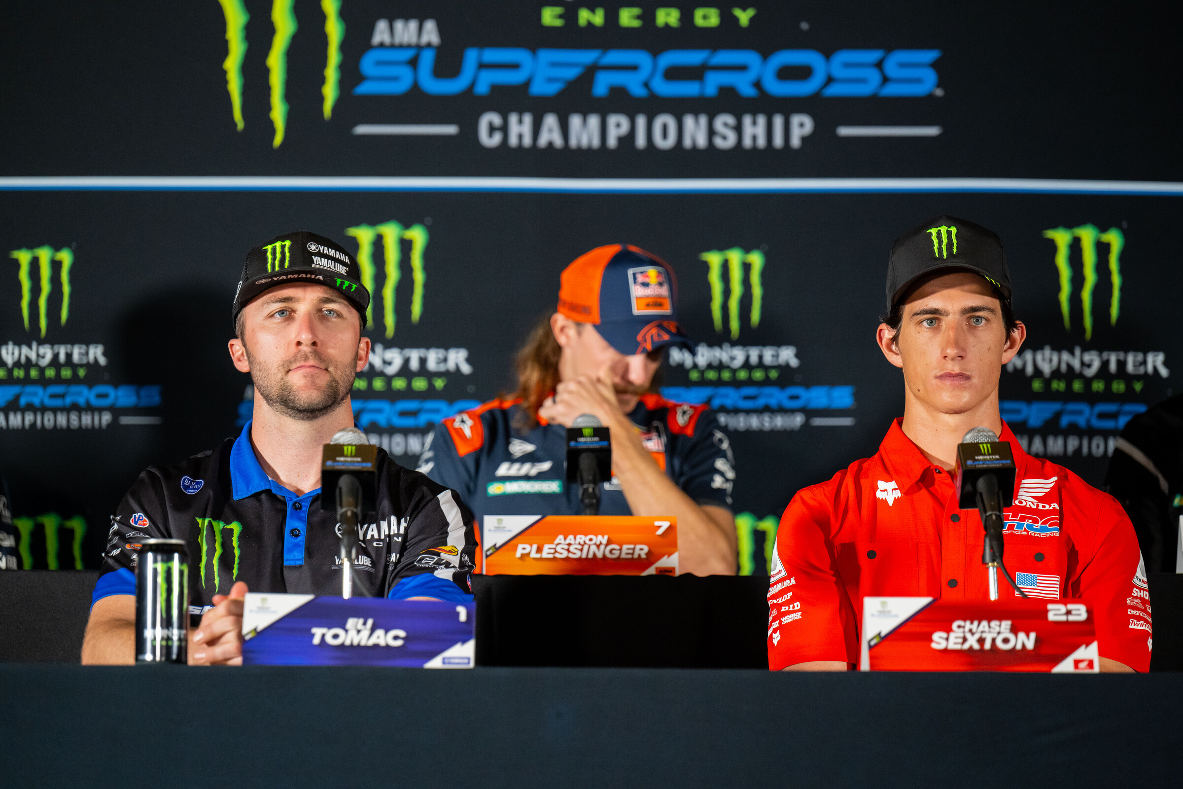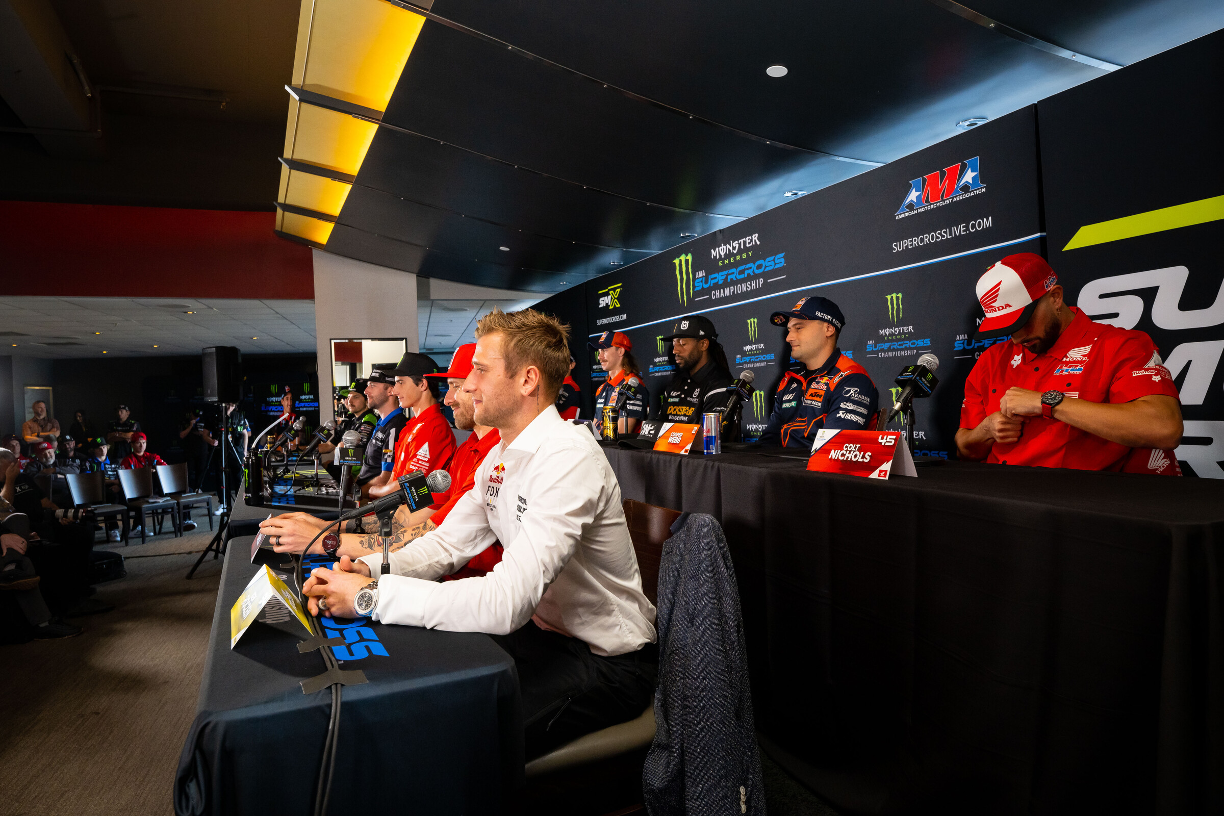 As they roll in for this press conference, everyone looks confident and ready, which they should—they’re all sharing the points lead right now. That of course changes tomorrow for the 450SX guys, as well as the 250SX West Region. It should be an amazing supercross season, and it all starts tomorrow.