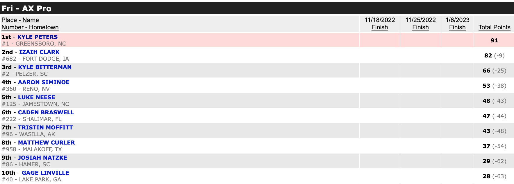 | 3 | Cooper Webb | Newport, NC | 304 |