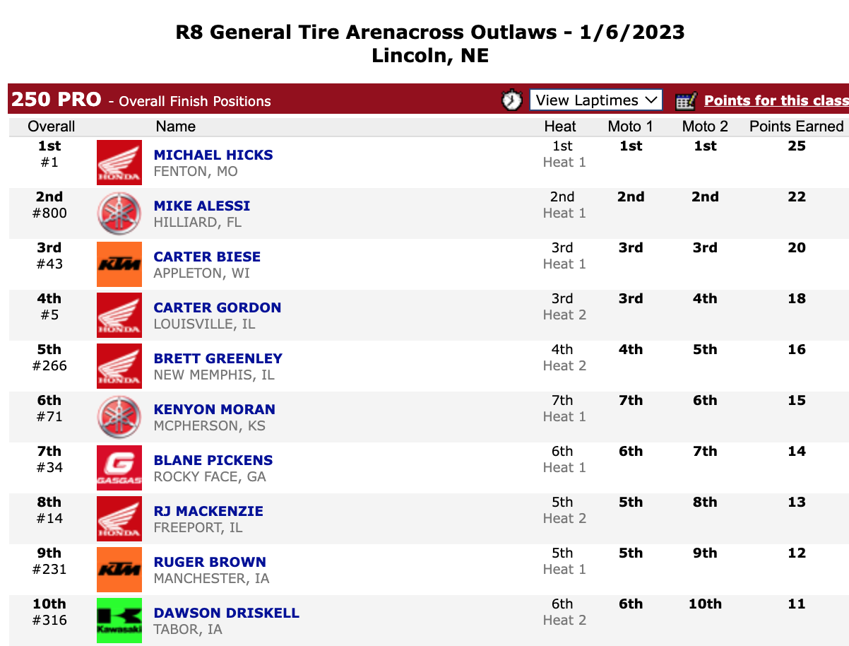 | Michael Hicks (Honda) | General Tire Arenacross Outlaws | 250 Pro |