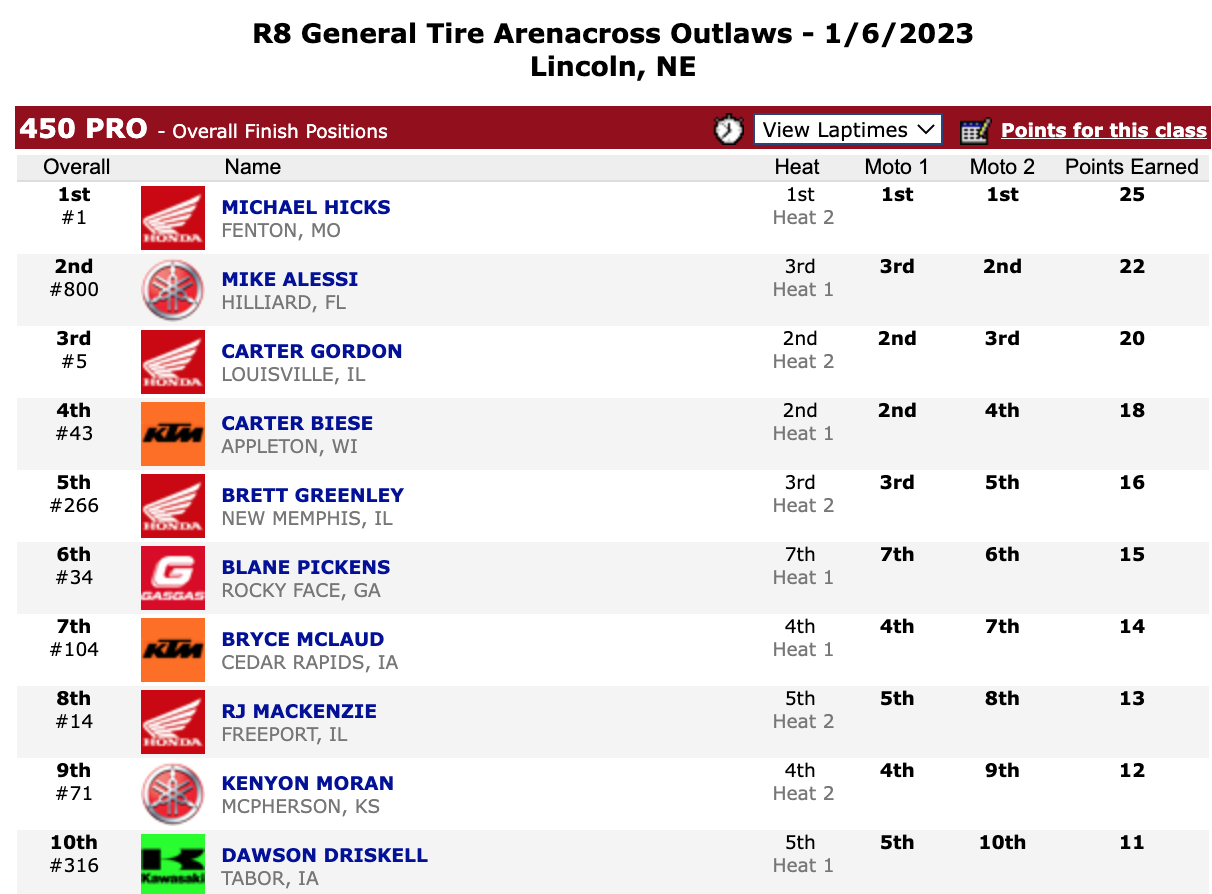 | Michael Hicks (Honda) | General Tire Arenacross Outlaws | 450 Pro |