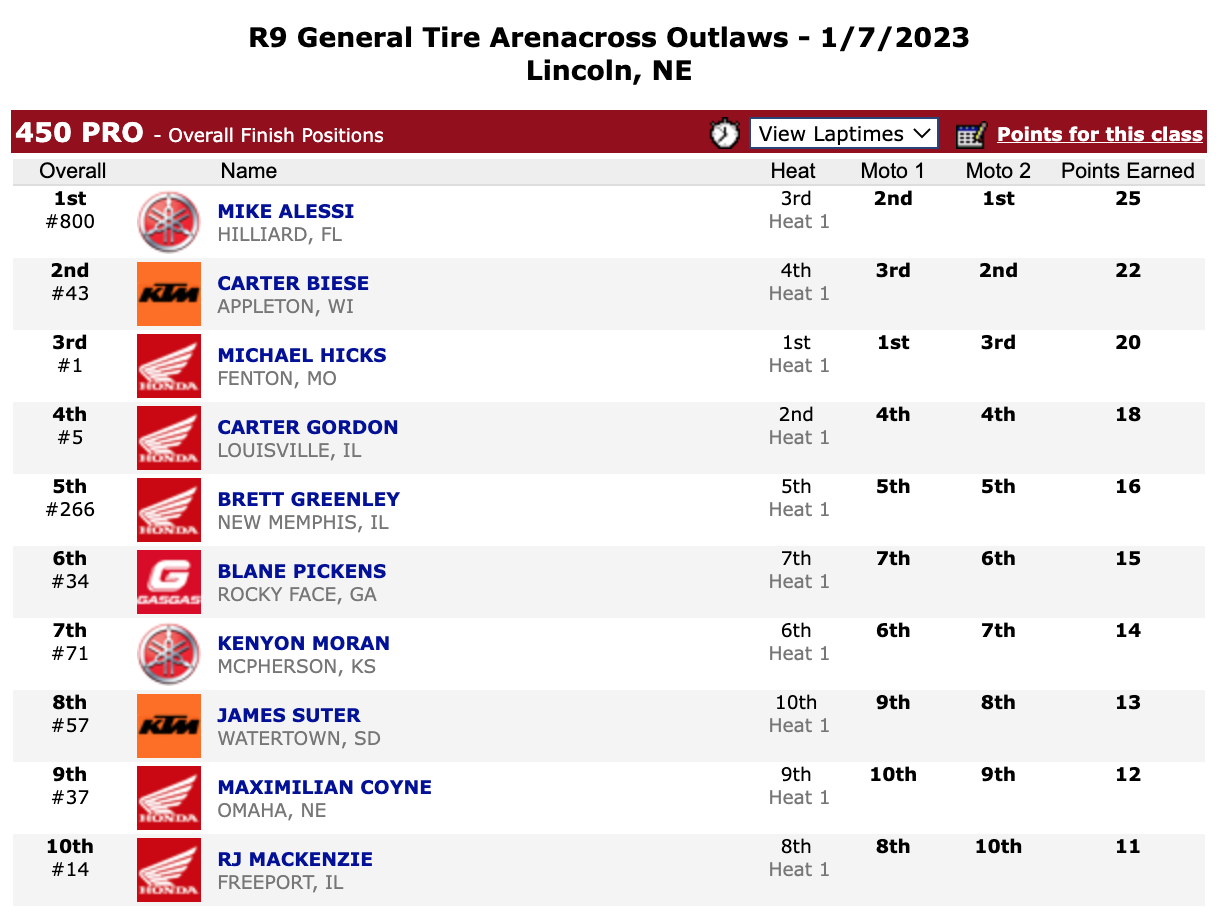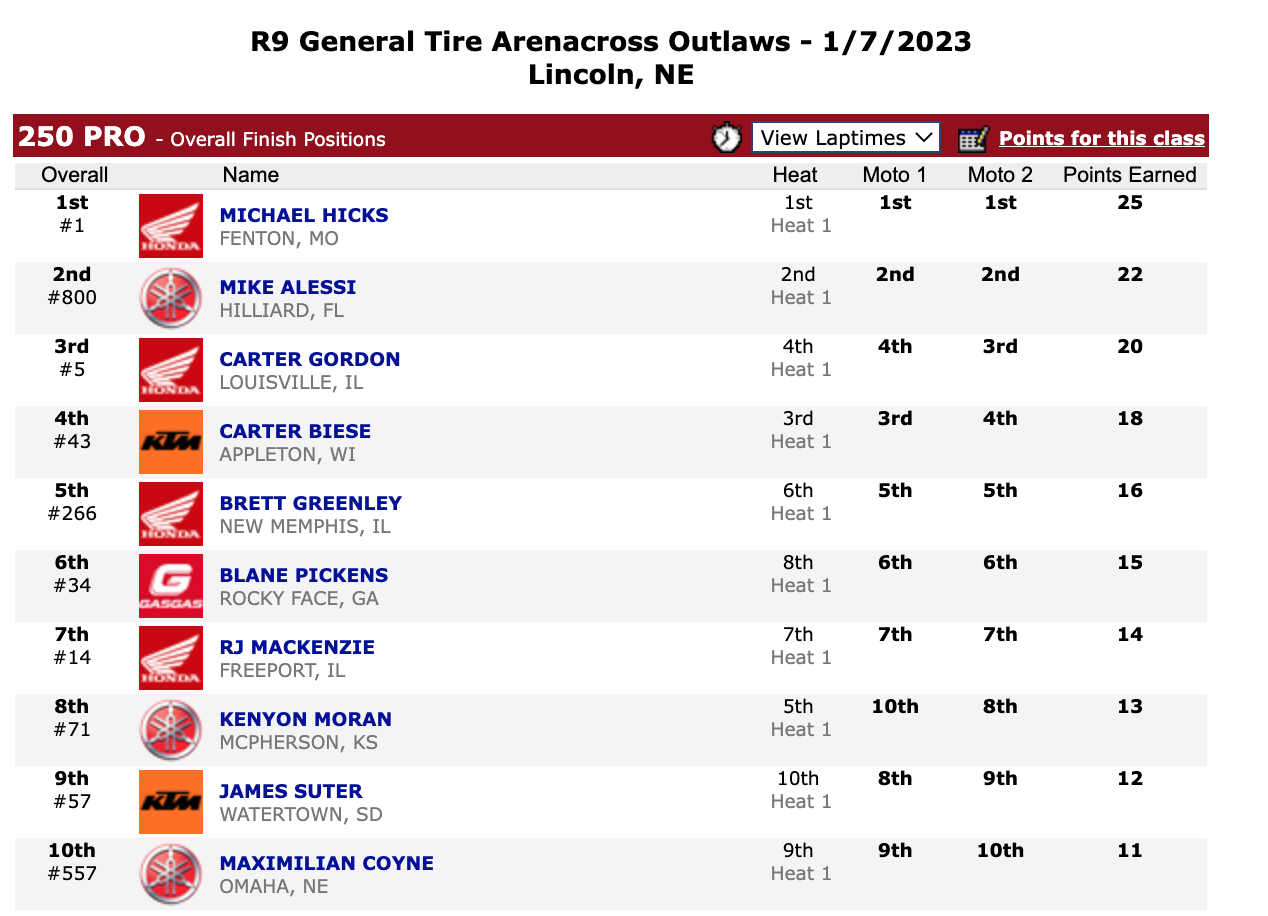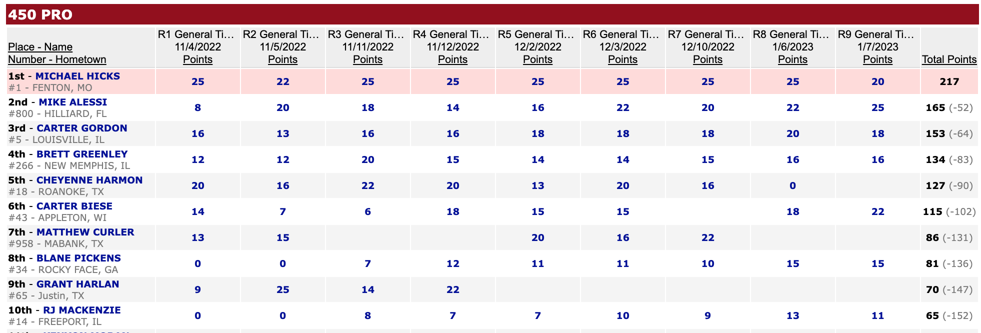 January 7, 2023| Rider | Time | Interval | Best Lap | Hometown | Bike | |