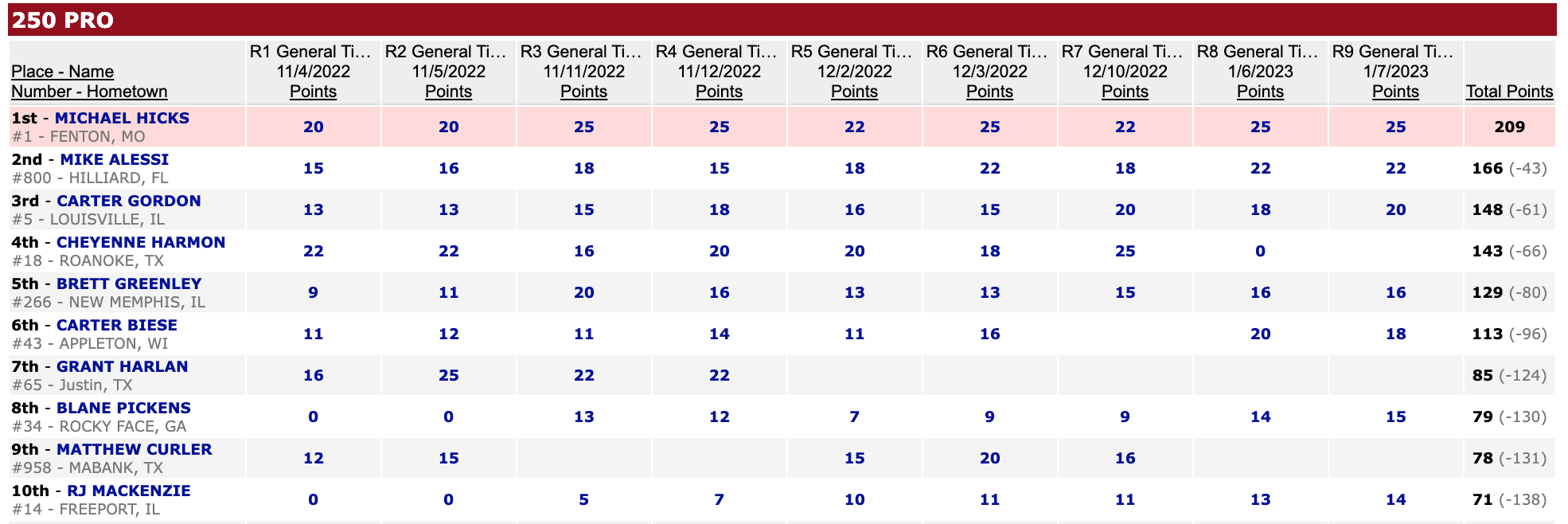 | 8 | Justin Hill | Yoncalla, OR | 212 |