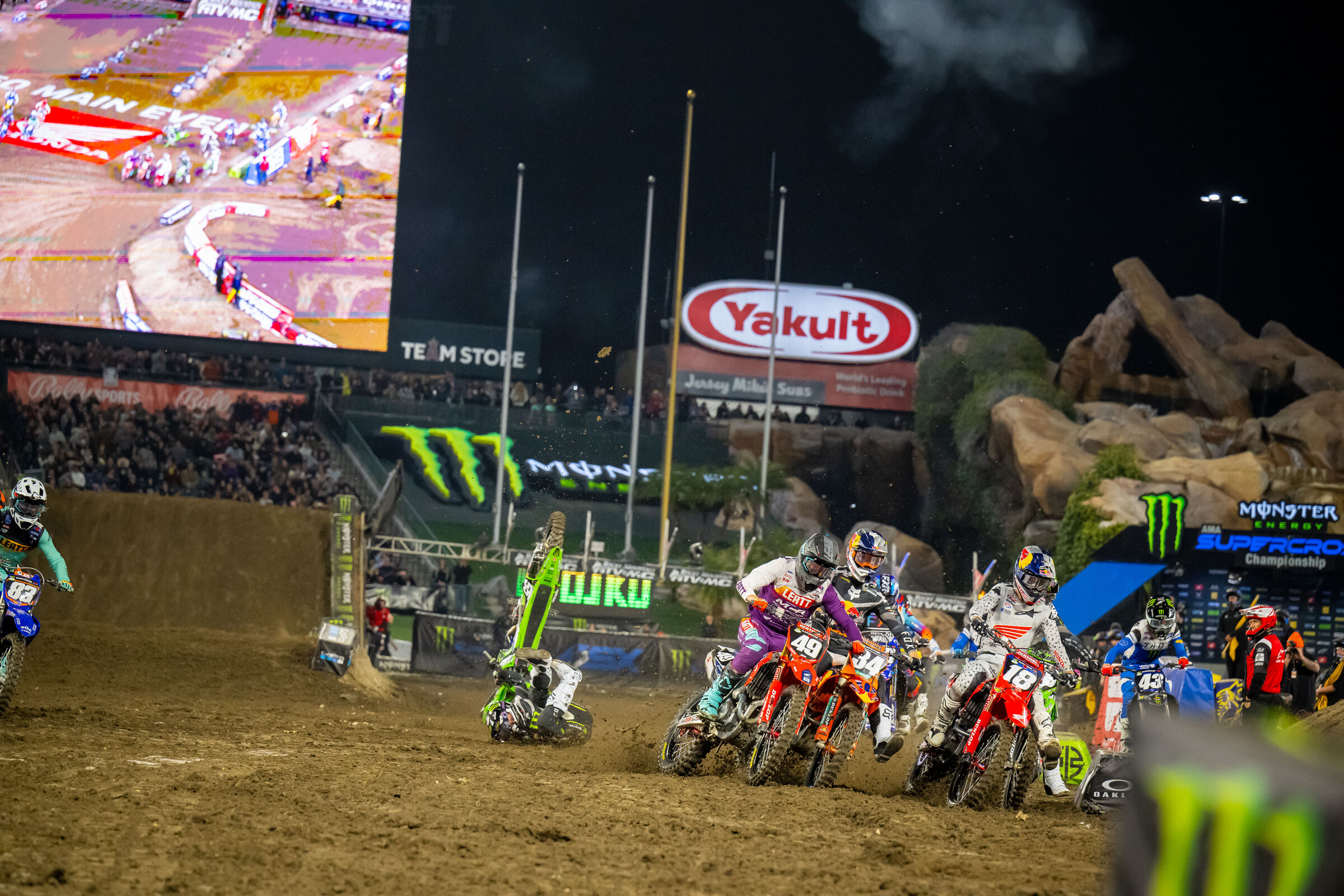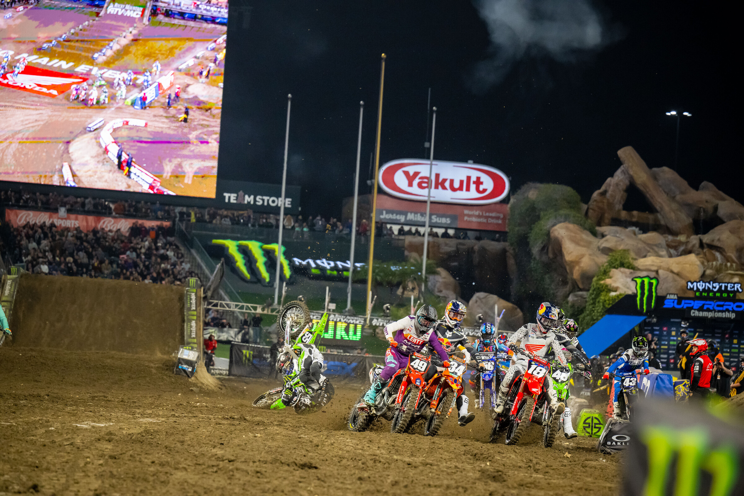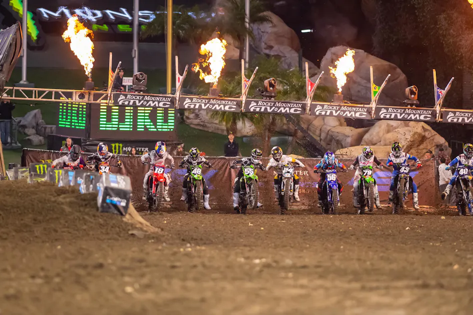 As the gates dropped and the pyrotechnics launched into the sky for the first main event of 2023 Monster Energy AMA Supercross, few could have expected what would happen next. As the riders for the 250SX West class stormed towards the first turn, there was suddenly the shocking image of a Kawasaki bouncing in the air just behind the scrum of riders. As everyone rolled through the first corner and continued on with the race, the settled dust left only Austin Forkner and his now bent up machine laying in the soil.