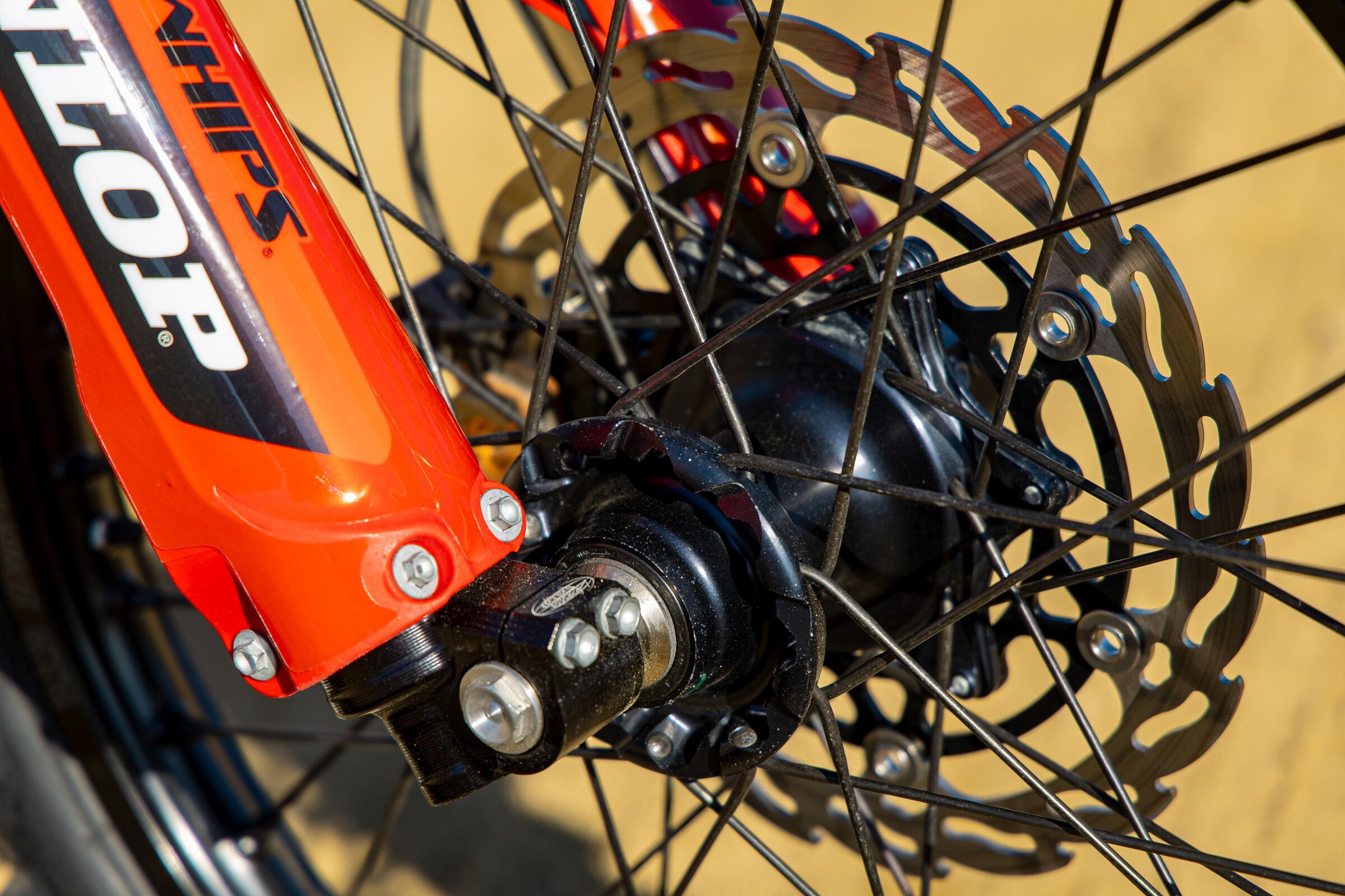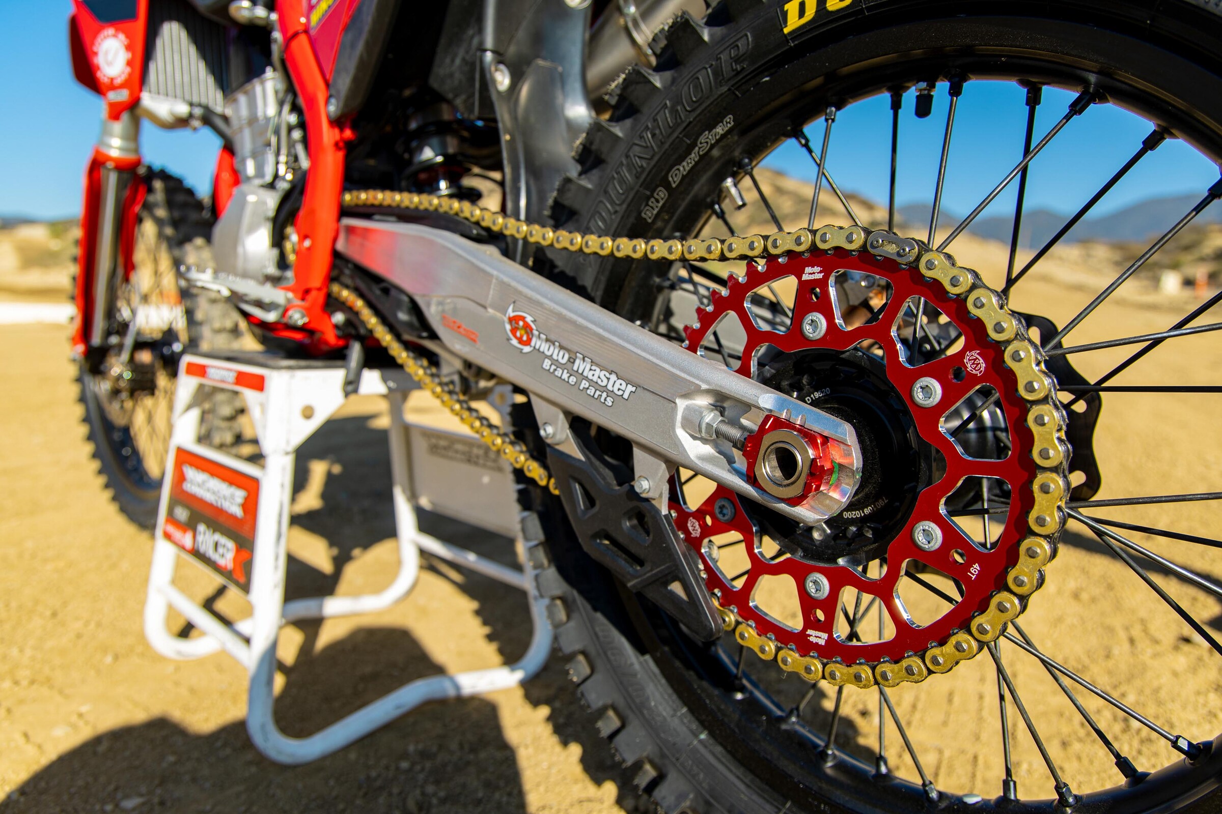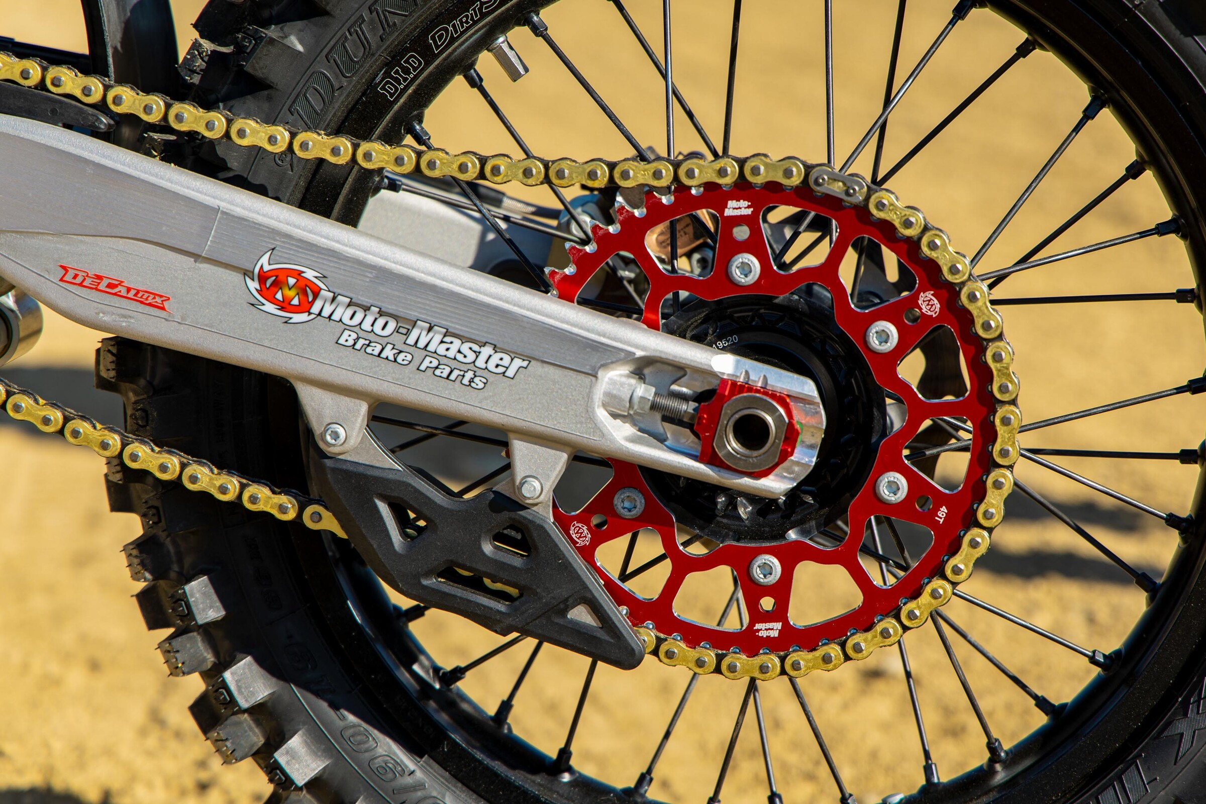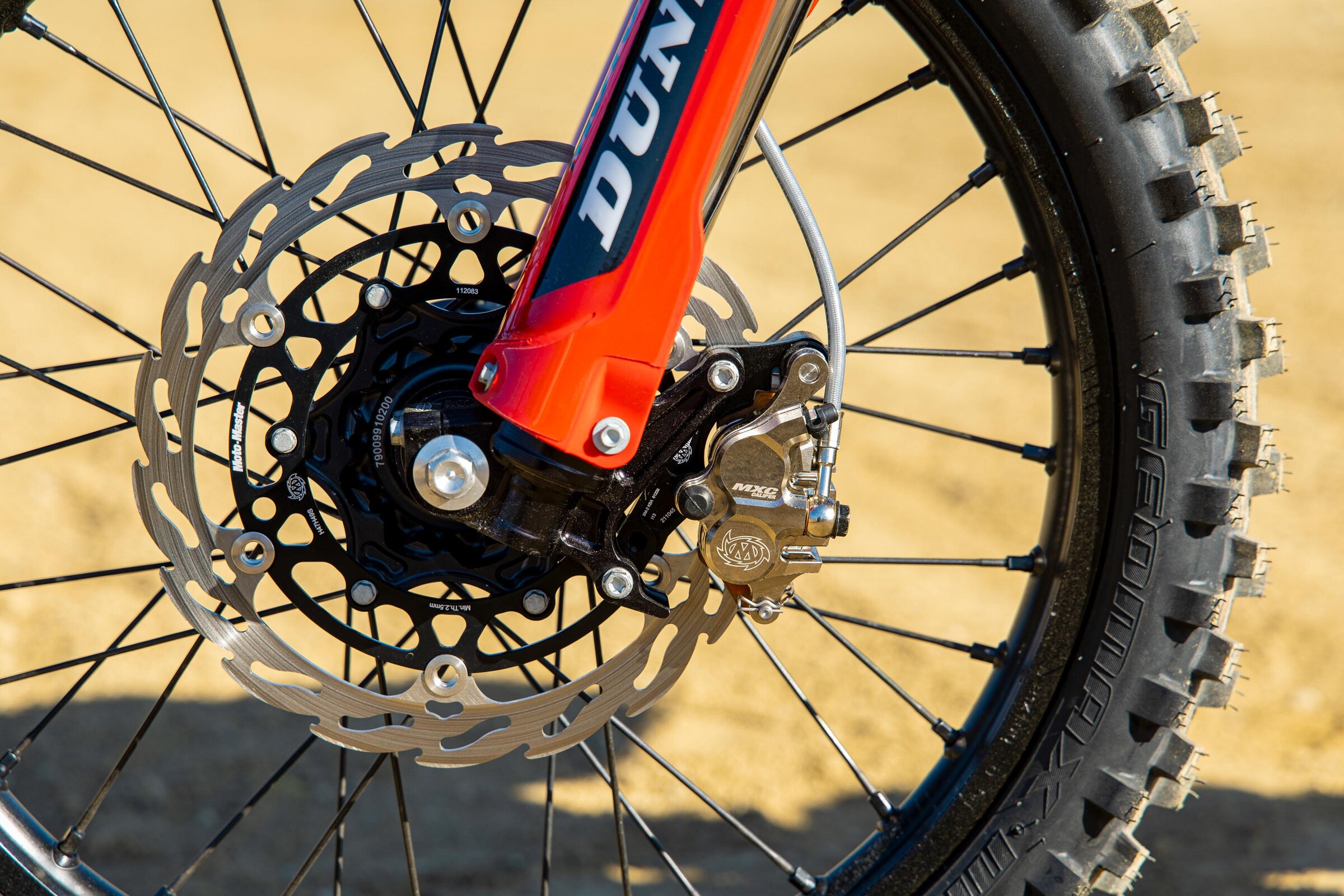 270mm Front Brake Disc, Oversize 270mm Adapter, MXC Front Caliper, MXC Rear Caliper, Steel Braided Brake Lines Front and Rear, Steel Front 13 Tooth Sproket, 7075 Rear 49 Tooth Sproket, GP 520 Gold Chain