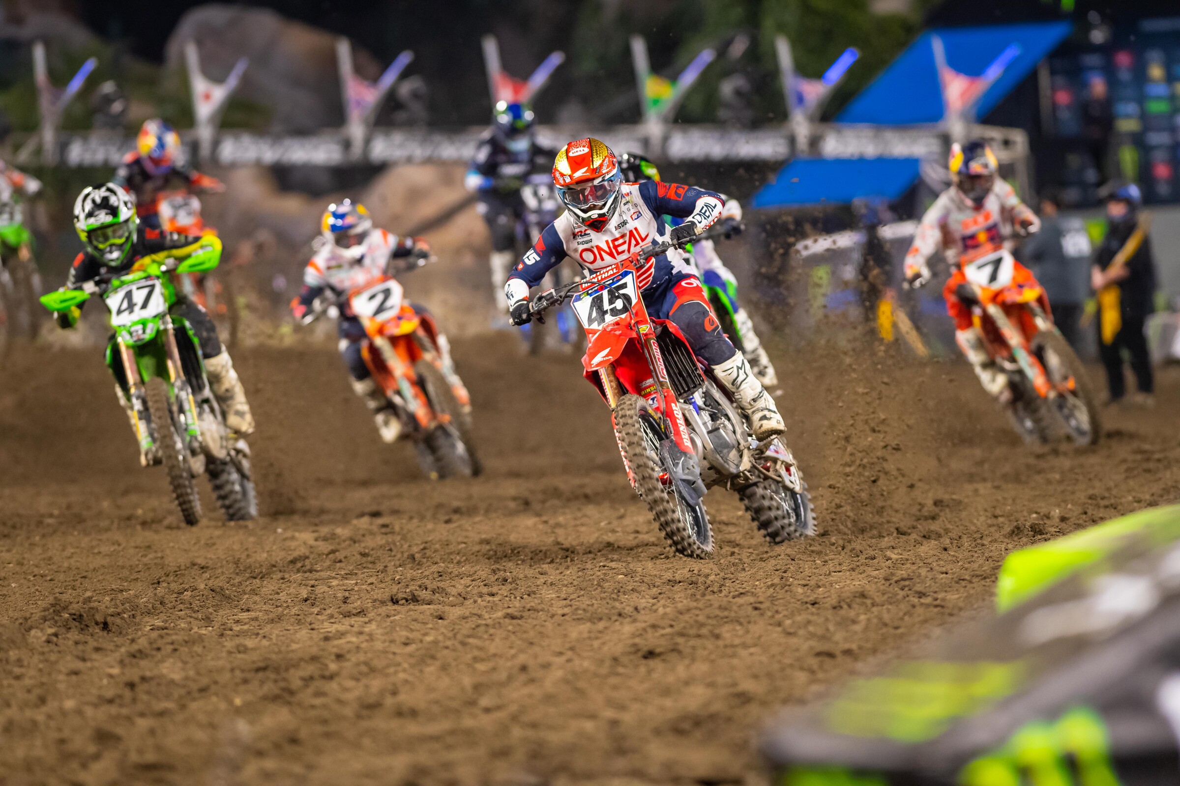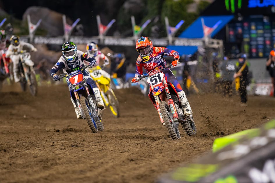 With great racing and lots of action, Anaheim 1 was full of stories in the 450SX main event. Monster Energy Yamaha/Star Racing’s Dylan Ferrandis came up from a bad start to charge all the way to fourth while Troy Lee Designs/Red Bull/GasGas’ Justin Barcia got the early lead before crashing twice and finishing 11th. Nestled between them was Honda HRC’s Colt Nichols who grabbed the holeshot and was immediately shuffled back to about ninth, where he basically stayed the whole race, before later claiming a sixth-place finish in his 450SX debut. To follow all of those storylines, we caught up with each of them after the race.