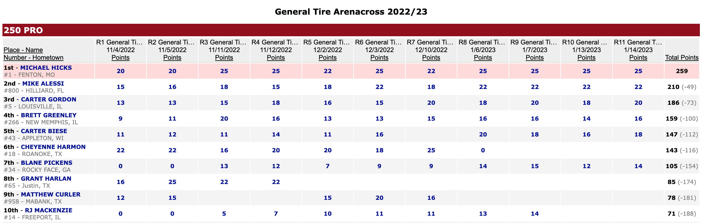 | 7 | Aaron Plessinger | Hamilton, OH | 236 |