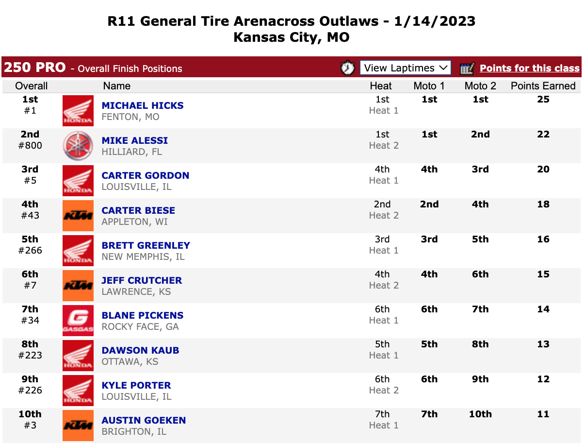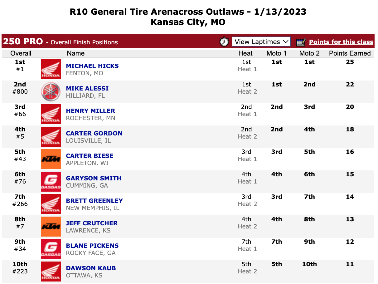 | Michael Hicks (Honda) | General Tire Arenacross Outlaws | 250 Pro |