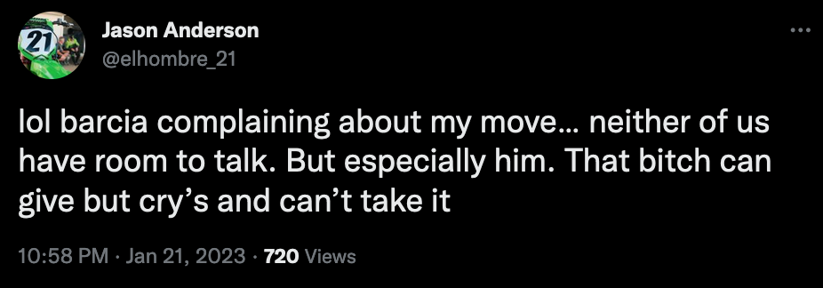 Another supercross, another day of drama for Justin Barcia. In his heat race, the Troy Lee Designs/Red Bull GasGas rider got knocked down by Jason Anderson. According to Anderson, Barcia was upset about it. Anderson took to twitter to say: “lol Barcia complaining about my move…neither of us have room to talk. But especially him. That bitch can give but cry’s [sic] and can’t take it.”