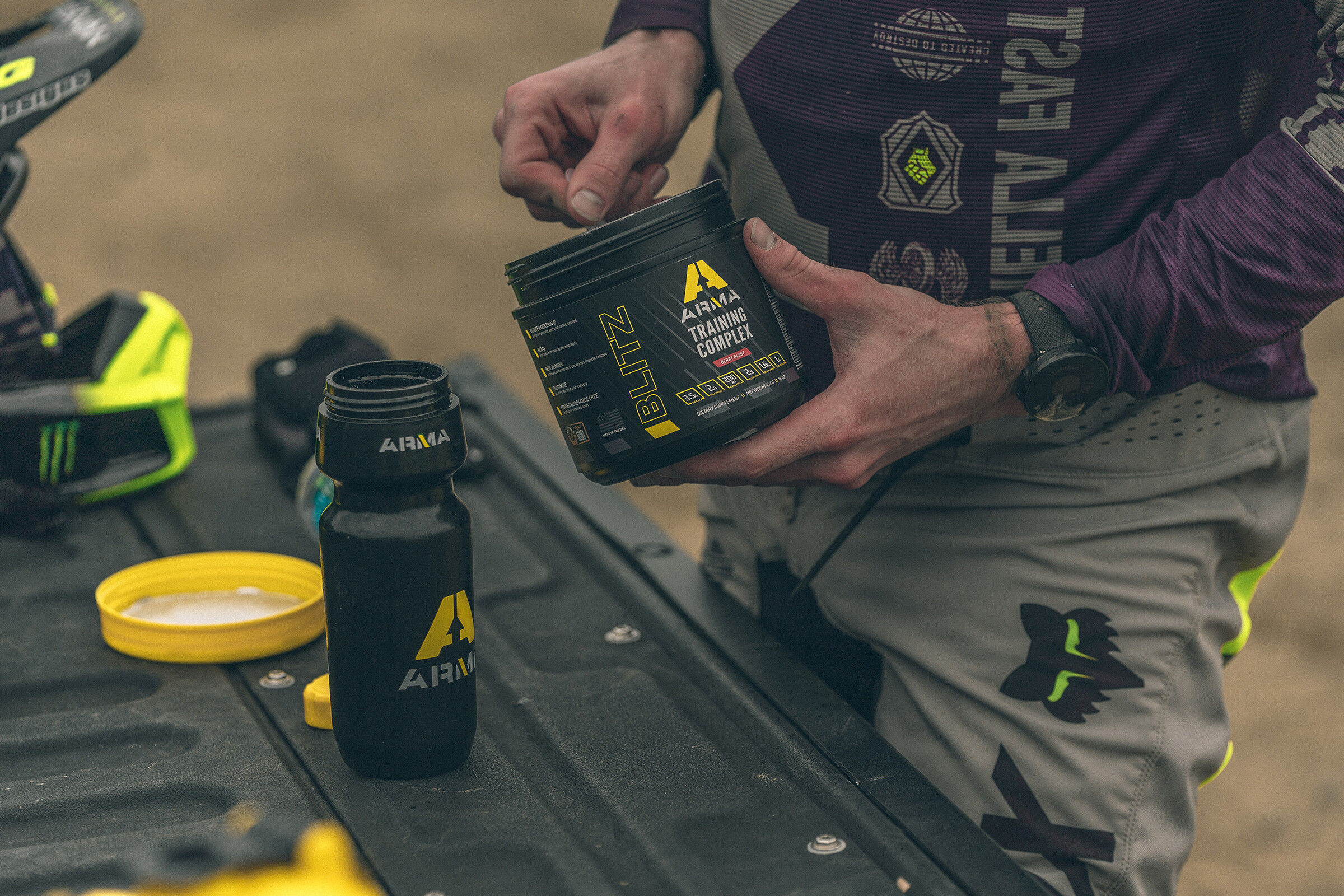 Next, let’s get nerdy and talk about supporting our muscles at a molecular level—or, in not-so-nerdy terms, preventing the scourge of dirt bike riders everywhere: The DREADED ARM PUMP. Yes, there are exercises you can do to help prevent it, and there is an element of bike tuning that will assist, but there’s a secret weapon in the world of nutrition that most folks don’t know about: Beta Alanine. Long story short, the stuff gives you superpowers. How? By boosting your VO2 capacity immediately. This gives your muscles far greater endurance, and can help make arm pump a thing of the past, especially with regular usage as it builds up in the body. Much like with hydration, there are a few nutrition products out there that supply Beta Alanine, but usually it’s in small doses—too small to make a noticeable difference but enough to make marketing claims. Once more, Arma’s got a solution: Blitz. It’s their moto superpower mix, packed with 1500mg of Beta Alanine per scoop, along with a ton of other ingredients at high dosage to help with muscle endurance like BCAAs, glutamine, and Cluster Dextrin. We’ve taken to pounding a scoop or two mixed into a water bottle before we hop on our bikes, and usually again at the two-hour mark as the effects begin to wear off. It’s even great for non-moto activities where our muscles are getting strained, like in the gym or out mountain biking. It really is a supplement that helps you push further for longer when you first use it.