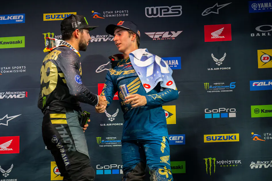 The 250SX class at the 2023 Tampa Supercross provided us with a thrilling battle for the win as Honda HRC’s Hunter Lawrence caught Monster Energy Yamaha Star Racing’s Nate Thrasher on the last lap of the race. Thrasher tried hard to defend against the move but Lawrence snuck up the inside in the last turn and blocked Thrasher. The still were nearly side by side over the finish line jump but the nod would go to Hunter Lawrence who clipped the timing loop 0.134 seconds before Thrasher did. It was Lawrence’s second straight win to start 2023 and he was elated with the effort. Thrasher, however, was dejected.