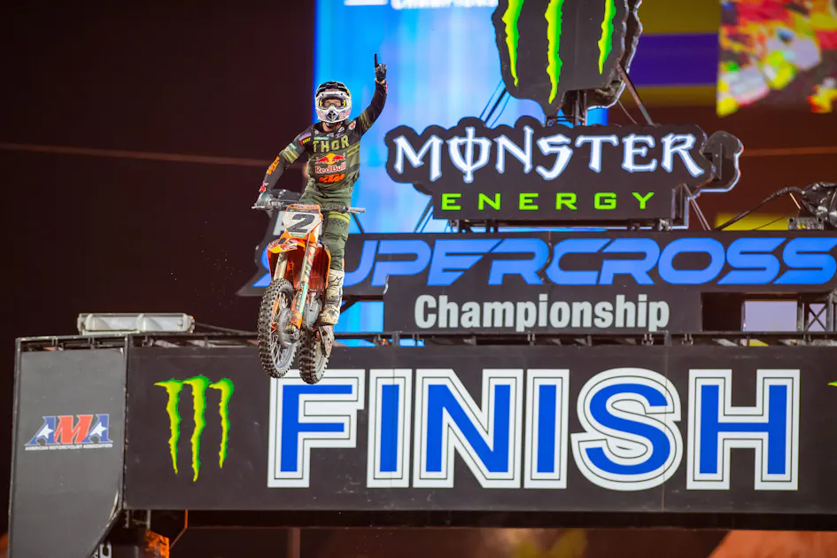 And now we have three winners in Monster Energy Supercross for 2023, with Cooper Webb doing Cooper Webb things to emerge with a victory in Tampa. Just a week ago, Webb wasn't on the leader's pace and Eli Tomac and Chase Sexton were threatening to break away from the supercross field like they did last summer in Pro Motocross. Webb went to work and figured it out, logging the type of ride in Tampa that is his trademark: starting up front, staying in the hunt, applying pressure, changing lines. Then when Sexton crashed from the lead, Webb had victory in hand.