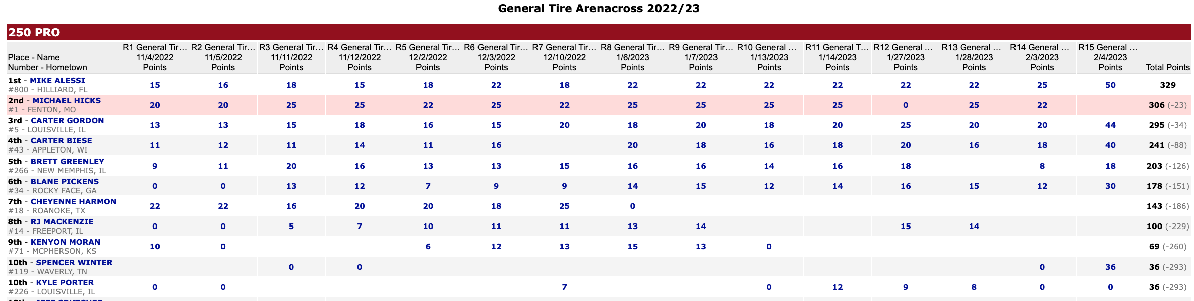 | Michael Hicks (Honda) | General Tire Arenacross Outlaws | 250 Pro |