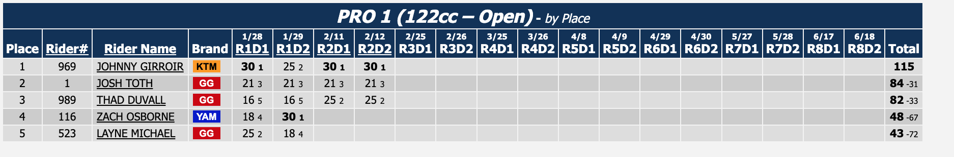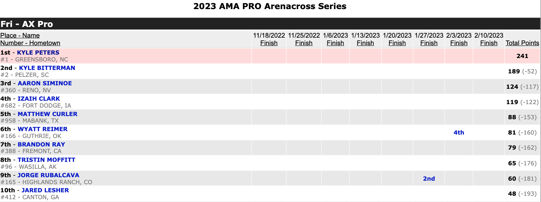 February 18, 2023| Rider | Time | Interval | Best Lap | Hometown | Bike | |