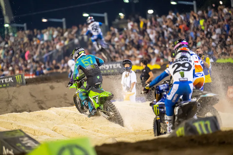 I don’t fault Thrasher here. He was trying to swing wide to make a run on Tom Vialle. That outside had been working throughout the night, allowing riders to pull alongside and slingshot past exiting the sand. He couldn’t have known Hunter would go for the jugular there.