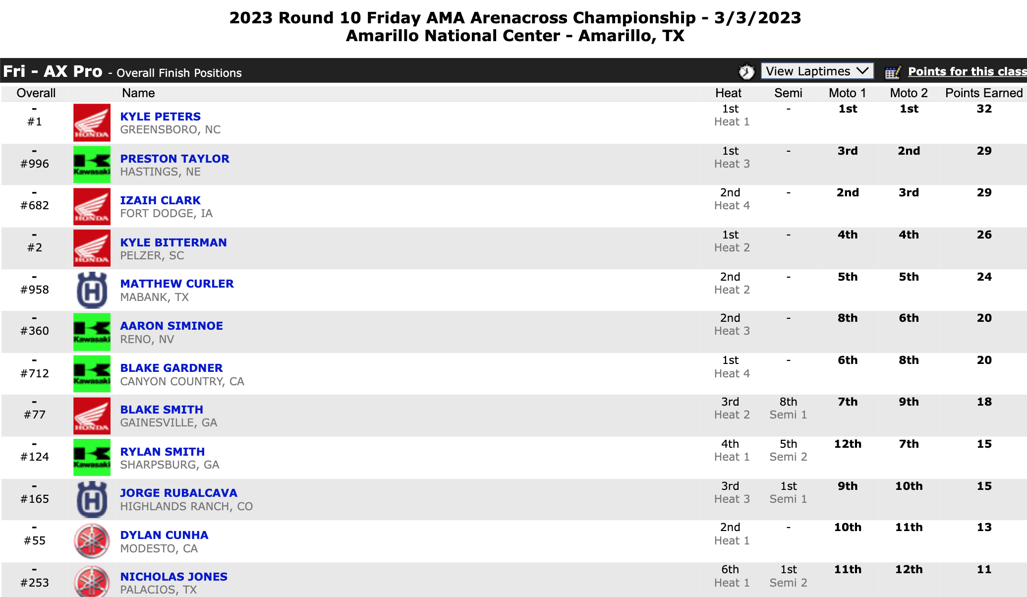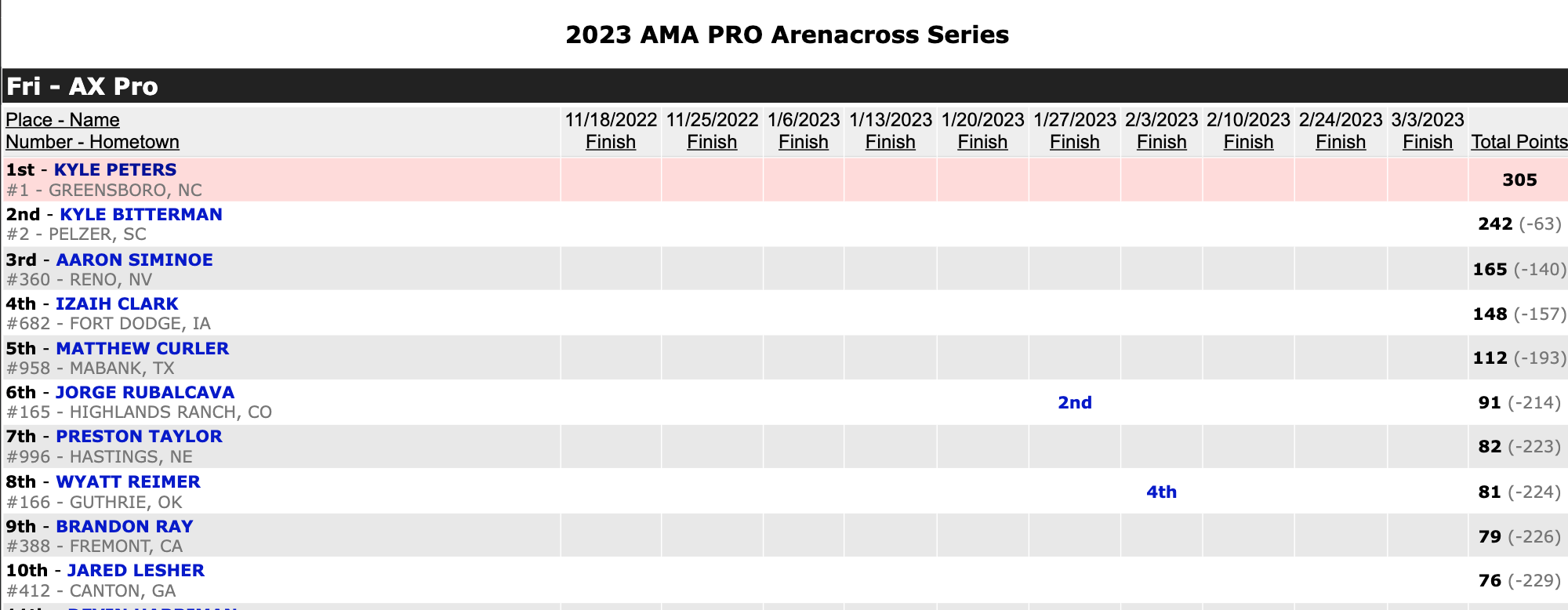 March 4, 2023| Rider | Time | Interval | Best Lap | Hometown | Bike | |