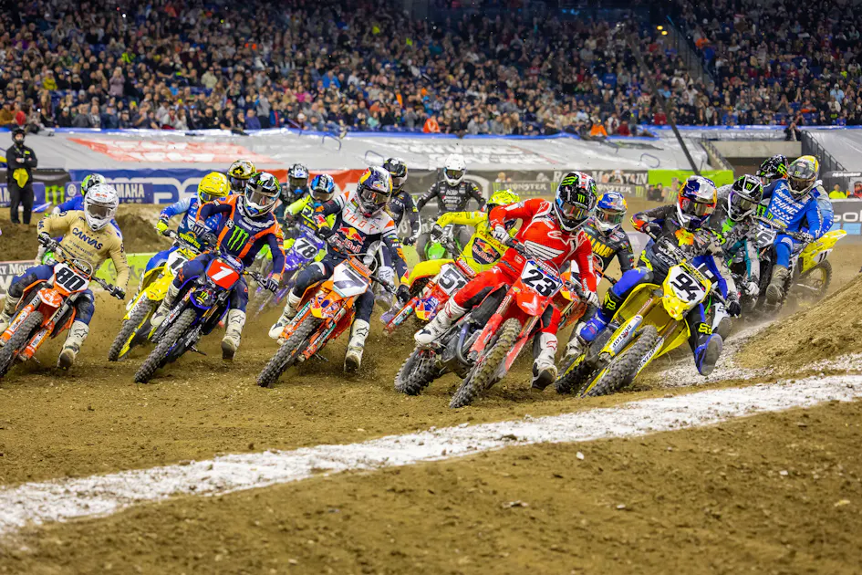 All day long in Indy, Hunter Lawrence looked determined to keep the ball rolling from his win at Daytona a week before as he qualified fastest on the day heading into the night show. When the gates dropped in the main event, it was Lawrence shooting out to the holeshot and early lead.